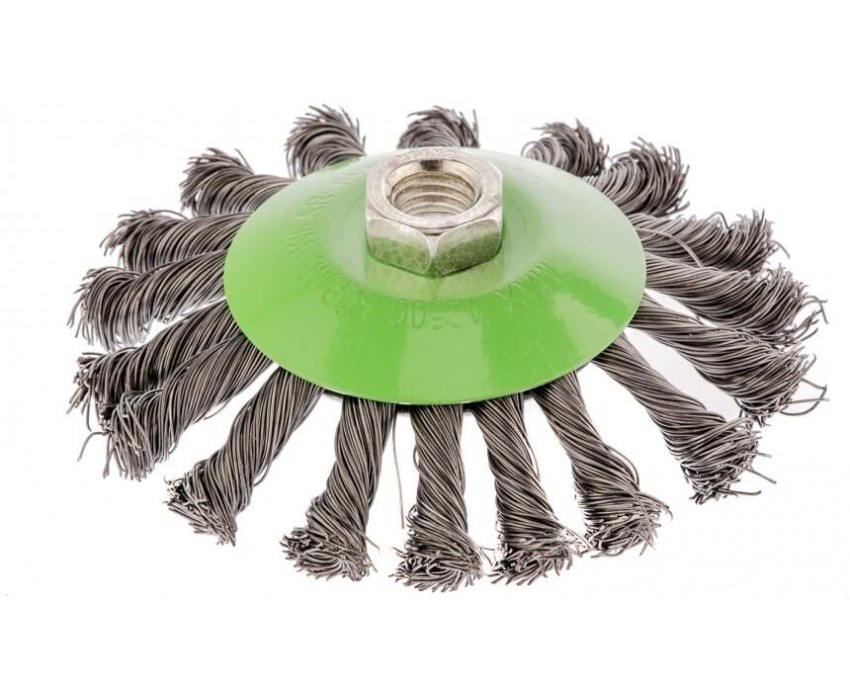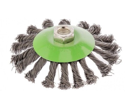 Щетка Сибртех «тарелка» 746107 диаметром 115 мм, с щетиной из крученой проволоки толщиной 0,5 мм, устанавливается на УШМ при помощи гайки М14. Выполнена в форме тарелки, за счет чего подходит для грубой (черновой) обработки плоских и угловых поверхностей. Удаляет ржавчину, загрязнения, лакокрасочные покрытия, подходит для зачистки сварных швов. Использование на скорости до 12500 об/мин позволяет продлить срок службы насадки. Преимущества Износостойкость — щетина изготовлена из высококачественной стальной проволоки. Универсальность — насадкой можно обрабатывать различные твердые материалы: металл, древесину, пластик, бетон. Антикоррозийная защита — на корпус нанесено эмалевое покрытие, щетина покрыта техническим маслом.