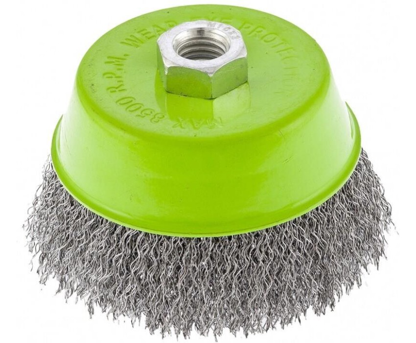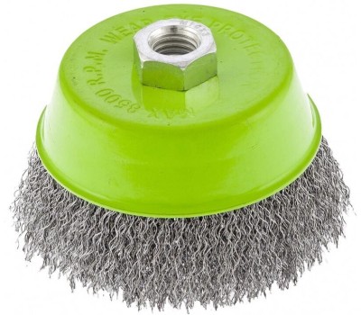 Щетка для УШМ Сибртех «чашка» 746057, М14, диаметром 100 мм, с щетиной из витой проволоки 0,3 мм, предназначена для постепенного снятия тонкого слоя материала с металлических, деревянных и пластиковых поверхностей. Удаляет ржавчину, загрязнения, а также остатки краски и других покрытий. Подходит для обработки участков значительной площади. Щетку устанавливают на вал углошлифовальной машины (УШМ), рекомендуемая максимальная скорость вращения 8500 об/мин. Работать с оснасткой следует в спецодежде. Преимущества Деформационная стойкость щетины — витая проволока принимает исходную форму после снятия нагрузок. Защита от коррозии — корпус покрыт эмалью, а на щетину нанесено техническое масло. Быстрая установка и замена насадки — щетка крепится на вал УШМ при помощи гайки М14.