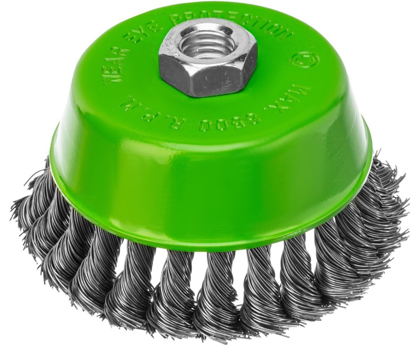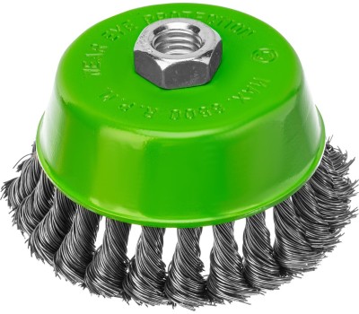 Щетка Сибртех «Чашка» 746287 диаметром 100 мм, с присоединительной резьбой М14, с щетиной из крученой проволоки диаметром 0,5 мм, устанавливается на УШМ, поддерживающую работу со скоростью 8500 об/мин. Изделие предназначено для грубой (черновой) обработки поверхностей и подходит для удаления загрязнений, снятия толстого слоя ржавчины, ЛКМ, зачистки сварных швов. Преимущества Прочность и долговечность — щетина из крученой стальной проволоки выдерживает значительные нагрузки. Высокая производительность — насадка формы «чашка» оптимальна для зачистки больших поверхностей. Универсальность — щетка подходит для обработки любых твердых материалов: металла, древесины, цветных металлов, пластика и т. д. Устойчивость к разрушению — корпус покрыт эмалью, а щетина —техническим маслом.