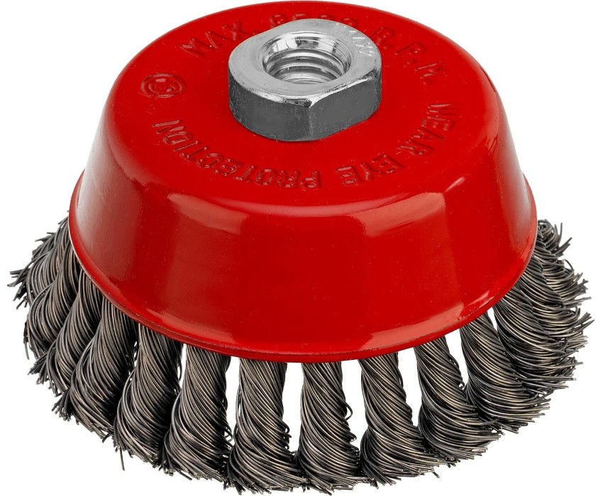 Щетка Matrix «Чашка» 74628 диаметром 100 мм, с присоединительной резьбой М14, с щетиной из крученой проволоки диаметром 0,5 мм, устанавливается на УШМ, поддерживающую работу со скоростью 8500 об/мин. Изделие предназначено для грубой (черновой) обработки поверхностей и подходит для удаления загрязнений, снятия толстого слоя ржавчины, ЛКМ, зачистки сварных швов. Преимущества Прочность и долговечность — щетина из крученой стальной проволоки выдерживает значительные нагрузки. Высокая производительность — насадка формы «чашка» оптимальна для зачистки больших поверхностей. Универсальность — щетка подходит для обработки любых твердых материалов: металла, древесины, цветных металлов, пластика и т. д. Устойчивость к разрушению — корпус покрыт эмалью, а щетина —техническим маслом.