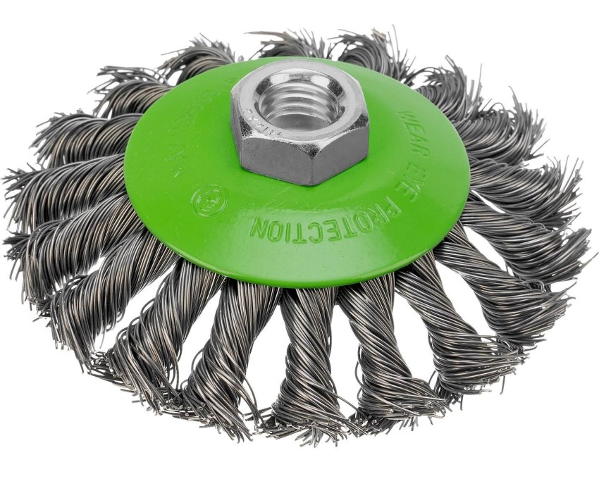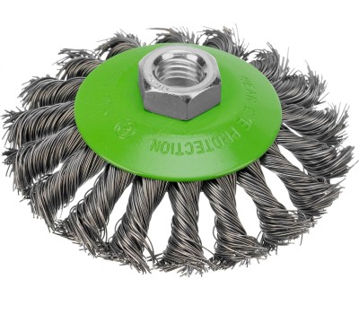 Щетка Сибртех «тарелка» 746097 диаметром 100 мм, с щетиной из крученой проволоки толщиной 0,5 мм, устанавливается на УШМ при помощи гайки М14. Выполнена в форме тарелки, за счет чего подходит для грубой (черновой) обработки плоских и угловых поверхностей. Удаляет ржавчину, загрязнения, лакокрасочные покрытия, подходит для зачистки сварных швов. Использование на скорости до 12500 об/мин позволяет продлить срок службы насадки. Преимущества Износостойкость — щетина изготовлена из высококачественной стальной проволоки. Универсальность — насадкой можно обрабатывать различные твердые материалы: металл, древесину, пластик, бетон. Антикоррозийная защита — на корпус нанесено эмалевое покрытие, щетина покрыта техническим маслом.