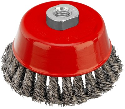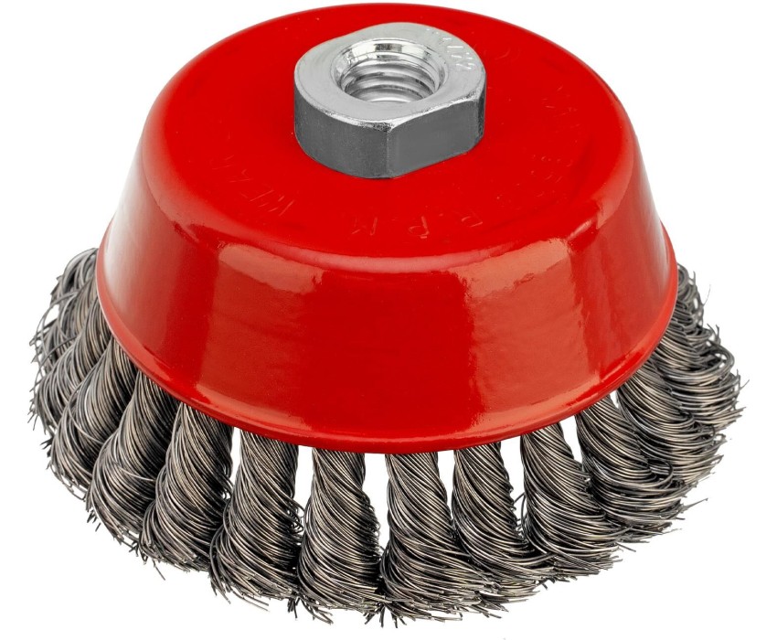 Щетка Matrix «Чашка» 74615 диаметром 100 мм, с присоединительной резьбой М14, с щетиной из крученой проволоки диаметром 0,35 мм, устанавливается на УШМ, поддерживающую работу со скоростью 8500 об/мин. Щетина предназначена для грубой (черновой) обработки поверхностей, менее агрессивной по сравнению с щетиной 0,5 мм. Изделие подходит для удаления загрязнений, снятия толстого слоя ржавчины, ЛКМ, зачистки сварных швов. Преимущества Прочность и долговечность — щетина из крученой стальной проволоки выдерживает значительные нагрузки. Высокая производительность — насадка формы «чашка» оптимальна для зачистки больших поверхностей. Универсальность — щетка подходит для обработки любых твердых материалов: металла, древесины, цветных металлов, пластика и т. д. Устойчивость к разрушению — корпус покрыт эмалью, а щетина —техническим маслом.