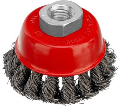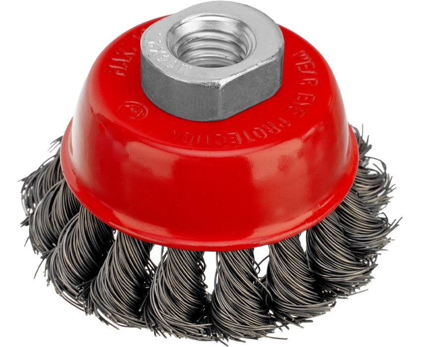 Щетка Matrix «Чашка» 74613 диаметром 65 мм, с присоединительной резьбой М14, с щетиной из крученой проволоки диаметром 0,35 мм, устанавливается на УШМ, поддерживающую работу со скоростью 12500 об/мин. Щетина предназначена для грубой (черновой) обработки поверхностей, менее агрессивной по сравнению с щетиной 0,5 мм. Изделие подходит для удаления загрязнений, снятия толстого слоя ржавчины, ЛКМ, зачистки сварных швов. Преимущества Прочность и долговечность — щетина из крученой стальной проволоки выдерживает значительные нагрузки. Высокая производительность — насадка формы «чашка» оптимальна для зачистки больших поверхностей. Универсальность — щетка подходит для обработки любых твердых материалов: металла, древесины, цветных металлов, пластика и т. д. Устойчивость к разрушению — корпус покрыт эмалью, а щетина —техническим маслом.