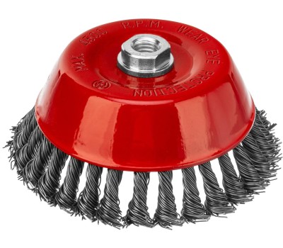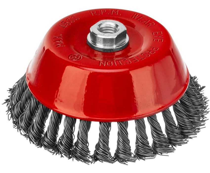 Щетка Matrix «Чашка» 74626 диаметром 150 мм, с присоединительной резьбой М14, с щетиной из крученой проволоки диаметром 0,8 мм, устанавливается на УШМ, поддерживающую работу со скоростью 4500 об/мин. Щетина предназначена для грубой (черновой) обработки поверхностей, более агрессивной по сравнению с щетиной 0,5 мм. Изделие подходит для удаления загрязнений, снятия толстого слоя ржавчины, ЛКМ, зачистки сварных швов. Преимущества Прочность и долговечность — щетина из крученой стальной проволоки выдерживает значительные нагрузки. Высокая производительность — насадка формы «чашка» оптимальна для зачистки больших поверхностей. Универсальность — щетка подходит для обработки любых твердых материалов: металла, древесины, цветных металлов, пластика и т. д. Устойчивость к разрушению — корпус покрыт эмалью, а щетина —техническим маслом.