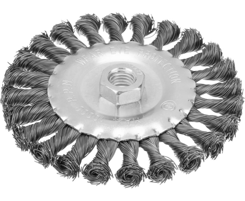 Плоская щетка Matrix 74640 диаметром 125 мм, с щетиной из крученой проволоки толщиной 0,5 мм и гайкой М14, — оснастка для УШМ, предназначенная для грубой (черновой) обработки поверхностей. Максимально допустимая скорость вращения шпинделя — 10000 об/мин. Щетка позволяет снять толстый слой ржавчины, лакокрасочных покрытий, загрязнений, а также зачистить сварные швы. Плоская форма удобна для обработки углов, изгибов и других труднодоступных мест. Преимущества Долговечность — щетина из высококачественной стальной проволоки устойчива к износу. Универсальность — щетка подходит для обработки любых твердых поверхностей: из металла, древесины, цветных металлов, пластика и т. д. Стойкость к разрушению — корпус оцинкован, а щетина покрыта техническим маслом для защиты от коррозии.