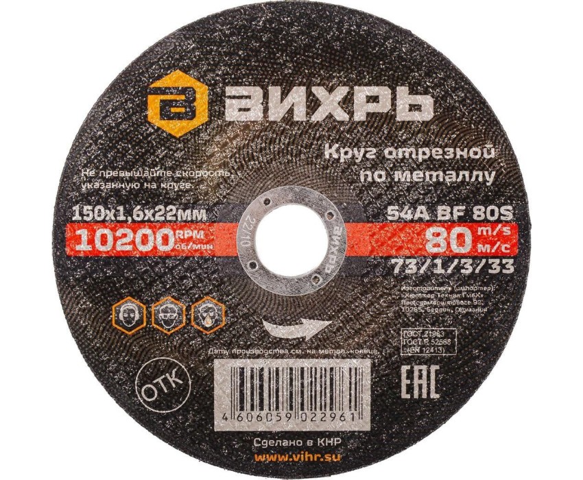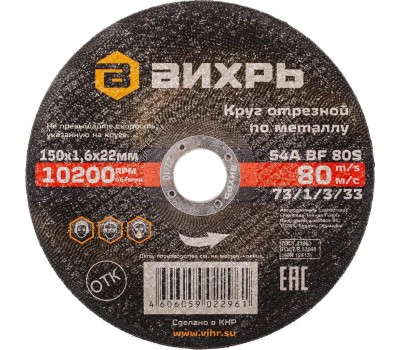 ВИХРЬ Диск отрезной по мет. 73/1/3/33 d=150мм d(посад.)=22.2мм (угловые шлифмашины) (упак.:25шт)