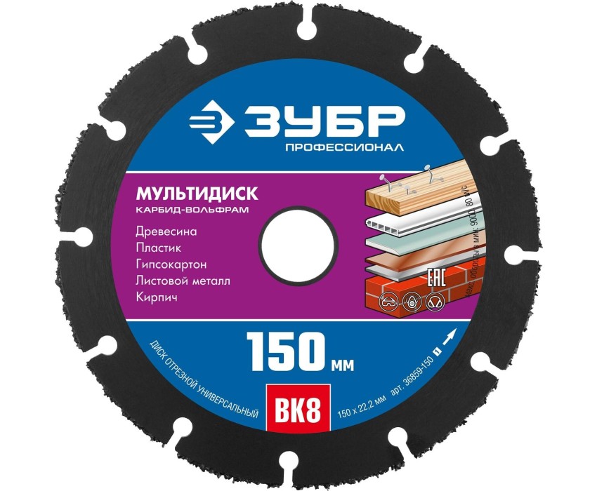Универсальный отрезной диск для УШМ ЗУБР МУЛЬТИДИСК это многоцелевой инструмент для решения разнообразных задач при проведении строительных и ремонтных работ Преимущества Специальная технология нанесения режущих элементов обеспечивают безопасность работы и высокий ресурс. Отсутствие деформаций благодаря наличию компенсационных прорезей Высокая скорость резания благодаря использованию твердосплавного зерна Использование Диск применяется на УШМ для грубых, быстрых распилов твердой и мягкой древесины, древесины с гвоздями и остатками цемента, клееной фанеры, пластика, тонколистового и цветного металла, алюминиевого профиля, кирпича, а также гипсокартона