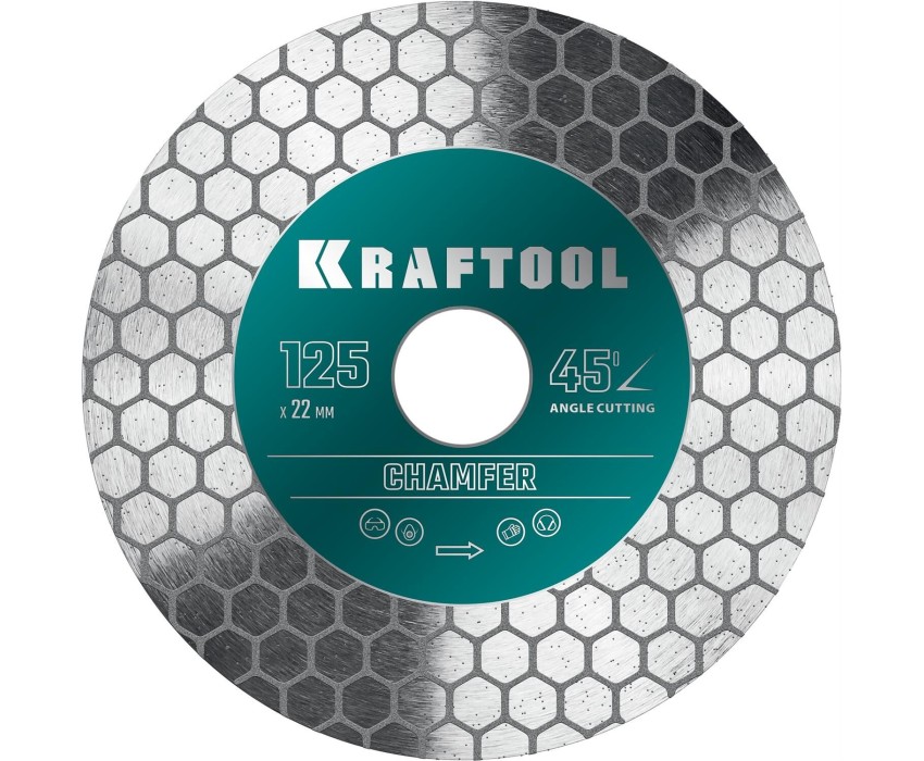 Шлифовально-отрезной алмазный диск Kraftool CHAMFER имеет современные характеристики и обладает большим запасом надежности для длительной и эффективной работы Преимущества Резка керамогранита и керамической плитки под углом 45 градусов Широкий двухсторонний алмазоносный слой шириной 25мм Специальная форма кромки в виде сот обеспечивает мягкий и высокопроизводительный рез Аккуратная и бережная подшлифовка и зашлифовка материала Технология горячего спекания Использование Резка керамогранита и керамической плитки под углом 45 градусов, подшлифовка торца плитки, зашлифовка неровностей. Применяется на УШМ.