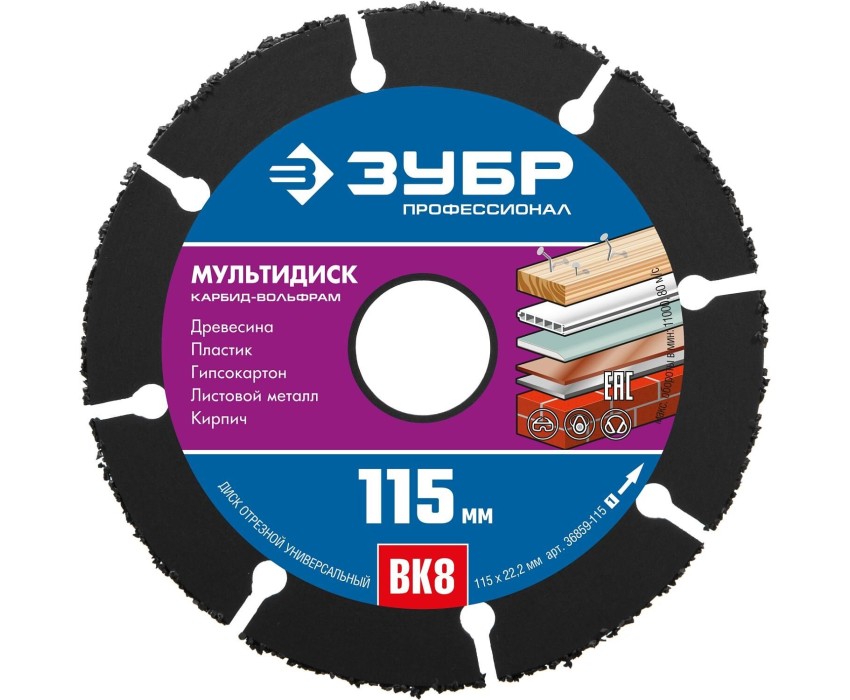 Универсальный отрезной диск для УШМ ЗУБР МУЛЬТИДИСК это многоцелевой инструмент для решения разнообразных задач при проведении строительных и ремонтных работ Преимущества Специальная технология нанесения режущих элементов обеспечивают безопасность работы и высокий ресурс. Отсутствие деформаций благодаря наличию компенсационных прорезей Высокая скорость резания благодаря использованию твердосплавного зерна Использование Диск применяется на УШМ для грубых, быстрых распилов твердой и мягкой древесины, древесины с гвоздями и остатками цемента, фанеры, пластика, тонколистового и цветного металла, алюминиевого профиля, кирпича, а также гипсокартона