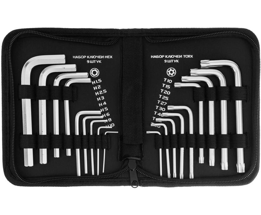 Набор Matrix 12314 включает 18 коротких сатинированных имбусовых ключей из стали CrV, применяющихся для монтажа и демонтажа резьбовых соединений с профилями HEX 1,5-10 мм и TORX Т10-Т50. Набор подходит для сборки мебели, ремонта велосипедов, бытовой техники и решения других задач. Две рабочие части и Г-образная форма облегчают работу в труднодоступных местах. Преимущества Прочность и долговечность — ключи из высококачественной стали CrV твердостью 50-55 HRC выдерживают длительное использование. Универсальность — набор включает 18 ключей с шестигранным и звездообразным профилем для работы с крепежом самых ходовых типоразмеров. Комфортная работа — сатинированные ключи с гладкой поверхностью без микронеровностей удобно ложатся в руку. Продуманное хранение и транспортировка — набор упакован в тканевый пенал на молнии.