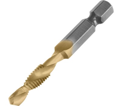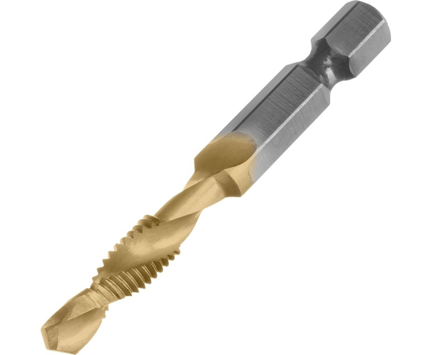 Сверло-метчик Denzel 76722 из стали P6M5 предназначено для получения глухих и сквозных отверстий в металлических заготовках с одновременным нарезанием правой резьбы M6 с шагом 1,0 мм. Позволяет существенно сэкономить время работы, объединив две операции в одну. Угол заточки 135° оптимален для работы с чугуном, сталью, алюминием, медью, бронзой. Ресурс оснастки увеличен в 10 раз по сравнению с аналогичными моделями из углеродистой стали. Преимущества Прочность — оснастка из быстрорежущей стали обеспечивает высокую эффективность работы в течение длительного времени. Долговечность — нитридтитановое покрытие защищает от повреждений и уменьшает трение, что увеличивает устойчивость сверла-метчика к износу. Быстрое засверливание — благодаря подточенной поперечной кромке можно приступать к работе без предварительной разметки поверхности (накернивания). Высокое качество выполняемых работ — сверлу-метчику присвоен класс точности 4H. Удобный поиск среди других инструментов — на хвостовик нанесена лазерная гравировка с обозначением типоразмера. Надежная фиксация — шестигранный хвостовик не проворачивается в патроне электроинструмента.