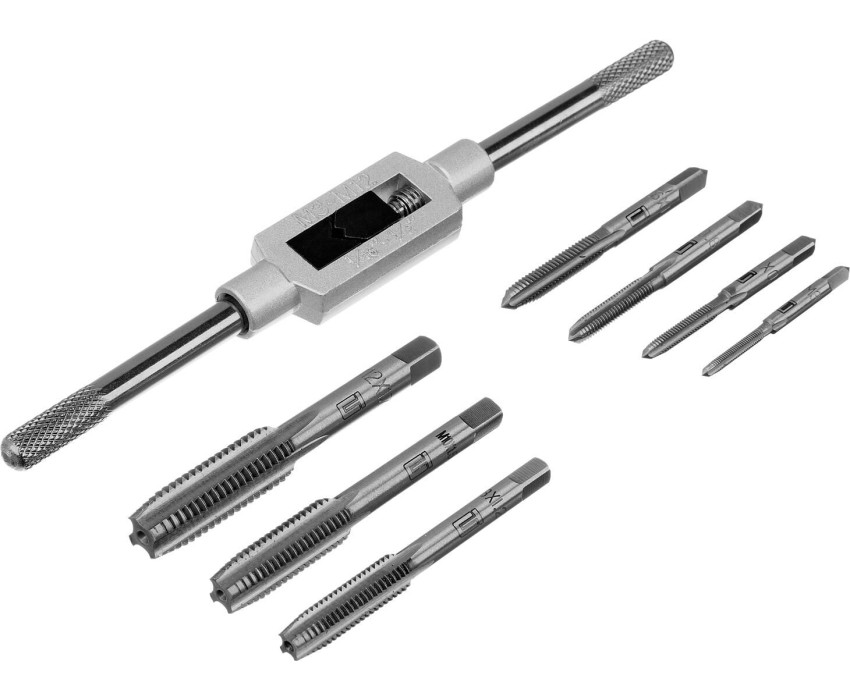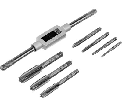 Набор метчиков М3-М12 Сибртех 77308 состоит из 8 предметов — метчикодержателя и метчиков, позволяющих вручную нарезать внутреннюю резьбу в сквозных и глухих отверстиях. Оптимален для работы с цветными металлами. Набор будет полезен при ремонте оборудования, автомобилей, а также пригодится в быту. Преимущества Повышенная прочность и износостойкость — метчики изготовлены из легированной стали 9ХС. Высокий рабочий ресурс — твердость рабочих частей составляет 62-64 HRC, благодаря чему они долго сохраняют режущую способность. Крепкая фиксация метчиков — метчикодержатель оснащен надежным винтовым механизмом. Быстрый поиск нужного инструмента — на корпусе каждого метчика имеется маркировка с обозначением размера и шага резьбы.
