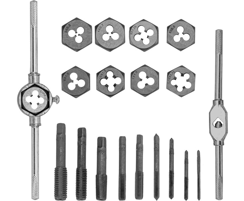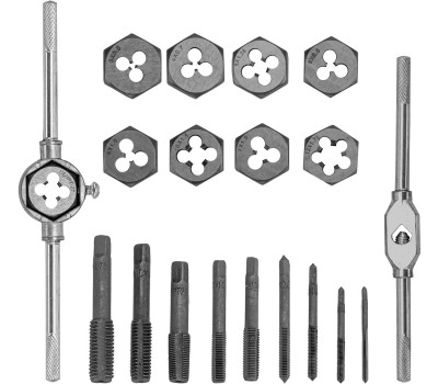 Набор метчиков и плашек М3-М12 Sparta 773105 из 20 предметов, с плашко- и метчикодержателем, в пластиковом боксе, используется для нарезания внешней и внутренней резьбы разного размера. Позволяет работать как с глухими, так и со сквозными отверстиями. Набор будет полезен во время выполнения ремонтных работ, подойдет для домашнего применения. Преимущества Эффективная работа с металлами повышенной прочности — резьбонарезные инструменты изготовлены из быстрорежущей стали. Универсальный метчикодержатель — регулируемый винтовой механизм позволяет надежно фиксировать метчики с хвостовиками от 2,3 до 6,5 мм. Получение ровной внешней резьбы — плашка закрепляется при помощи бокового винта и не проворачивается в держателе. Удобное хранение и транспортировка — набор поставляется в прочном пластиковом боксе.