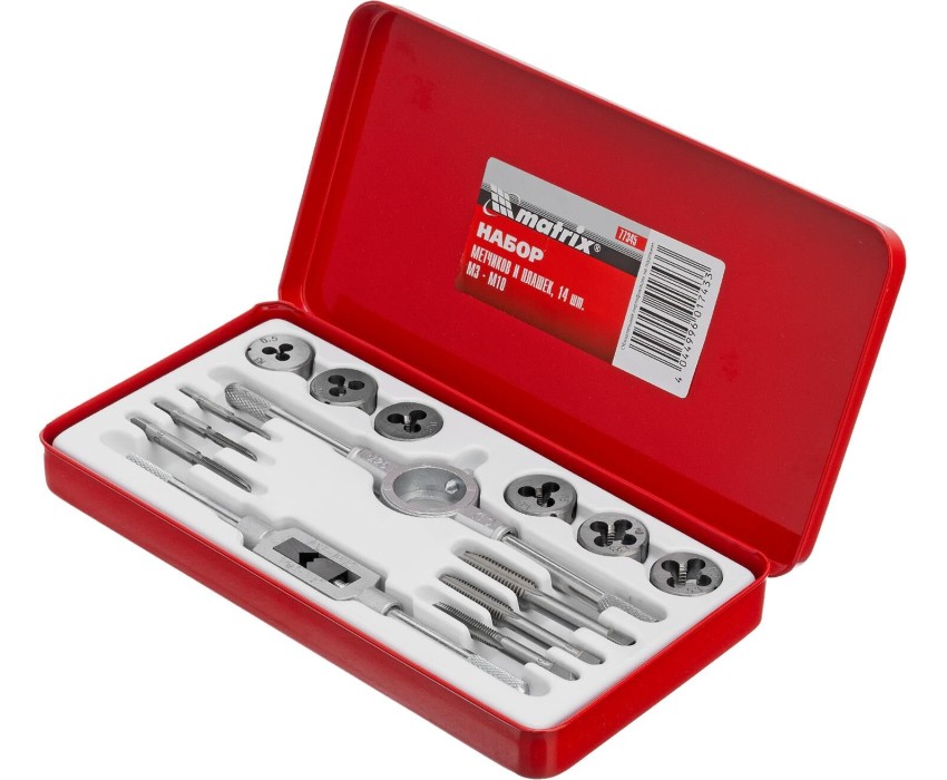 Набор метчиков и плашек М3-М10 Matrix 77345 состоит из 14 предметов — резьбонарезных инструментов, воротка и плашкодержателя. Используется для создания наружной и внутренней резьбы в сквозных и глухих отверстиях металлических деталей. Также с его помощью можно восстанавливать поврежденные резьбовые участки. Набор поставляется в металлическом кейсе, поэтому не потеряется при хранении или транспортировке. Будет полезен в слесарной мастерской, а также пригодится для проведения бытового ремонта. Преимущества Прочность и долговечность — резьбонарезные инструменты изготовлены из высокоуглеродистой стали 9ХС. Высокий ресурс — режущие части закалены до твердости 59-62 HRC и устойчивы к износу. Точная и чистая резьба — количество зубцов на калибрующей части плашек увеличено. Быстрый поиск нужного предмета — на каждом инструменте имеется маркировка с обозначением шага и размера резьбы. Комфортная и эффективная работа — плашку удерживают в держателе боковые винты, метчик крепко фиксируется в воротке посредством регулируемого винтового механизма.