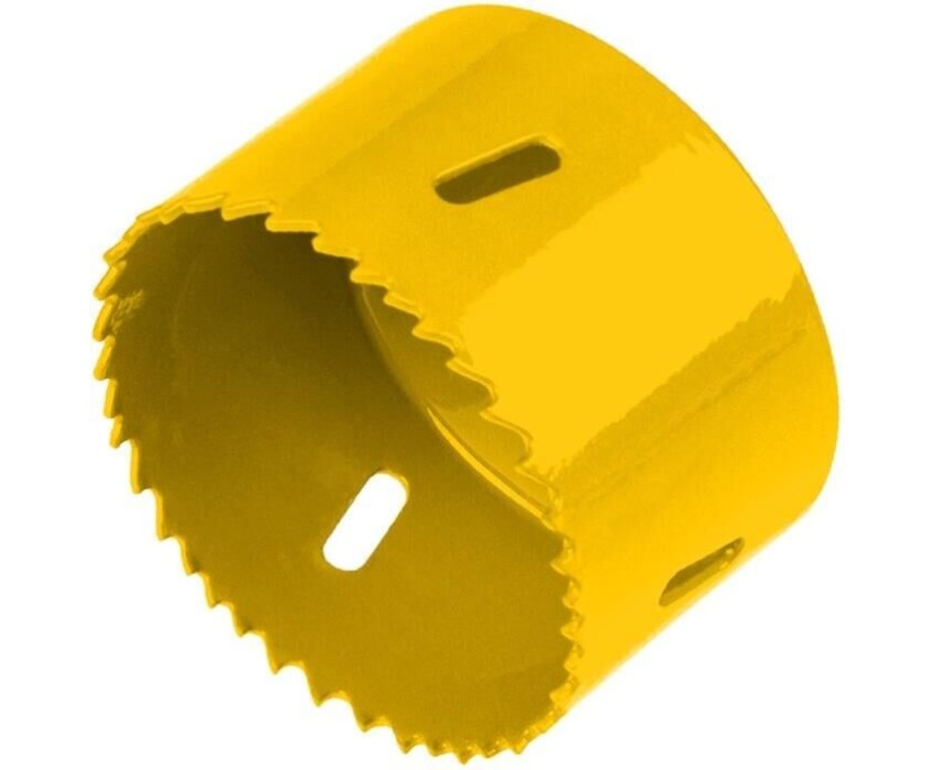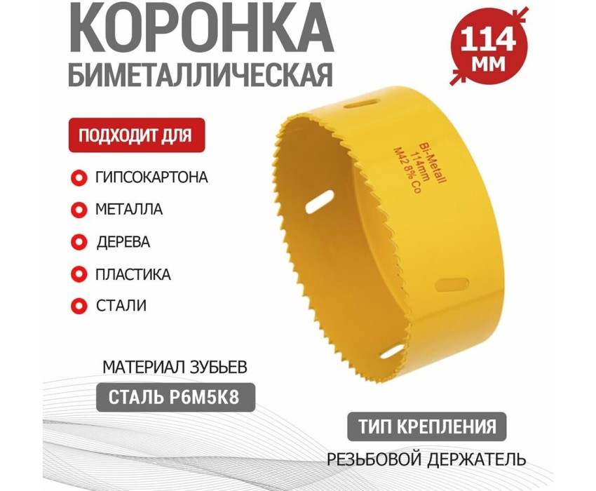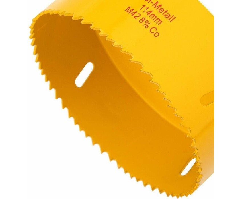 Коронка Bimetal используется во время электромонтажных работ и прокладки коммуникаций. Позволяет получить отверстия большого диаметра в таких материалах как пластик, дерево, сталь, металл и т.д. Применяется совместно с дрелями, перфораторами и стационарными станками. Тело коронки выполнено из инструментальной стали, а зубья с переменным шагом 4-6 мм изготовлены из быстрорежущей стали Р6М5К8, устойчивой к перегреву. Благодаря качеству используемых материалов оснастка отличается долгим ресурсом работы и высокой производительностью. Конструкция оснащена отверстиями, которые компенсируют деформации при перегреве, а также отводят строительную пыль и шлам. Коронка используется с шестигранным хвостовиком для сверления при помощи дрели или с хвостовиком SDS PLUS для сверления при помощи перфоратора. Хвостовики приобретаются отдельно. Сверление металла/стали необходимо осуществлять в безударном режиме с применением СОЖ.