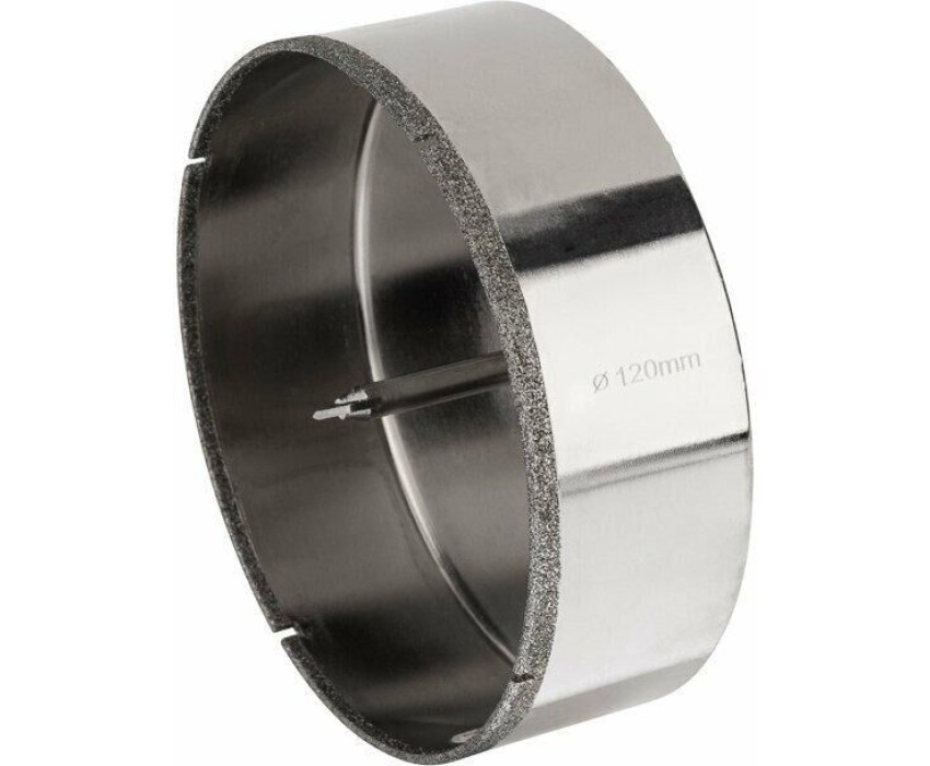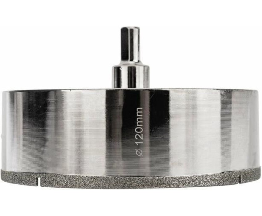 Алмазная коронка диаметром 120 мм используется при сверлении керамогранита, керамики, стекла. Наличие центровочного сверла обеспечивает точное позиционирование коронки на поверхности и помогает избежать смещения во время работ. Покрытие алмазной коронки выполнено гальваническим способом в два слоя, что обеспечивает эффективное сверление и продолжительный рабочий ресурс инструмента. Равномерное распределение алмазов по режущей кромке гарантирует аккуратное сверление материала без трещин и сколов. Высота алмазного слоя в 6 мм обеспечивает высокую производительность, а трехгранный хвостовик – надежную фиксации в патроне. При использовании алмазных коронок для сверления отверстий необходимо охлаждение, которое достигается путем подачи воды в рабочую зону.