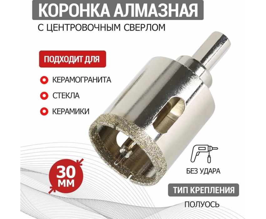 Алмазная коронка диаметром 30 мм используется при сверлении керамогранита, керамики, стекла. Наличие центровочного сверла обеспечивает точное позиционирование коронки на поверхности и помогает избежать смещения во время работ. Покрытие алмазной коронки выполнено гальваническим способом в два слоя, что обеспечивает эффективное сверление и продолжительный рабочий ресурс инструмента. Равномерное распределение алмазов по режущей кромке гарантирует аккуратное сверление материала без трещин и сколов. Высота алмазного слоя в 6 мм обеспечивает высокую производительность, а трехгранный хвостовик – надежную фиксации в патроне. При использовании алмазных коронок для сверления отверстий необходимо охлаждение, которое достигается путем подачи воды в рабочую зону.