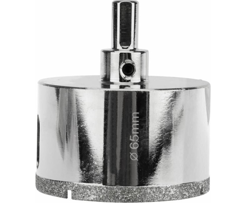 Алмазная коронка диаметром 65 мм используется при сверлении керамогранита, керамики, стекла. Наличие центровочного сверла обеспечивает точное позиционирование коронки на поверхности и помогает избежать смещения во время работ. Покрытие алмазной коронки выполнено гальваническим способом в два слоя, что обеспечивает эффективное сверление и продолжительный рабочий ресурс инструмента. Равномерное распределение алмазов по режущей кромке гарантирует аккуратное сверление материала без трещин и сколов. Высота алмазного слоя в 6 мм обеспечивает высокую производительность, а трехгранный хвостовик – надежную фиксации в патроне. При использовании алмазных коронок для сверления отверстий необходимо охлаждение, которое достигается путем подачи воды в рабочую зону.