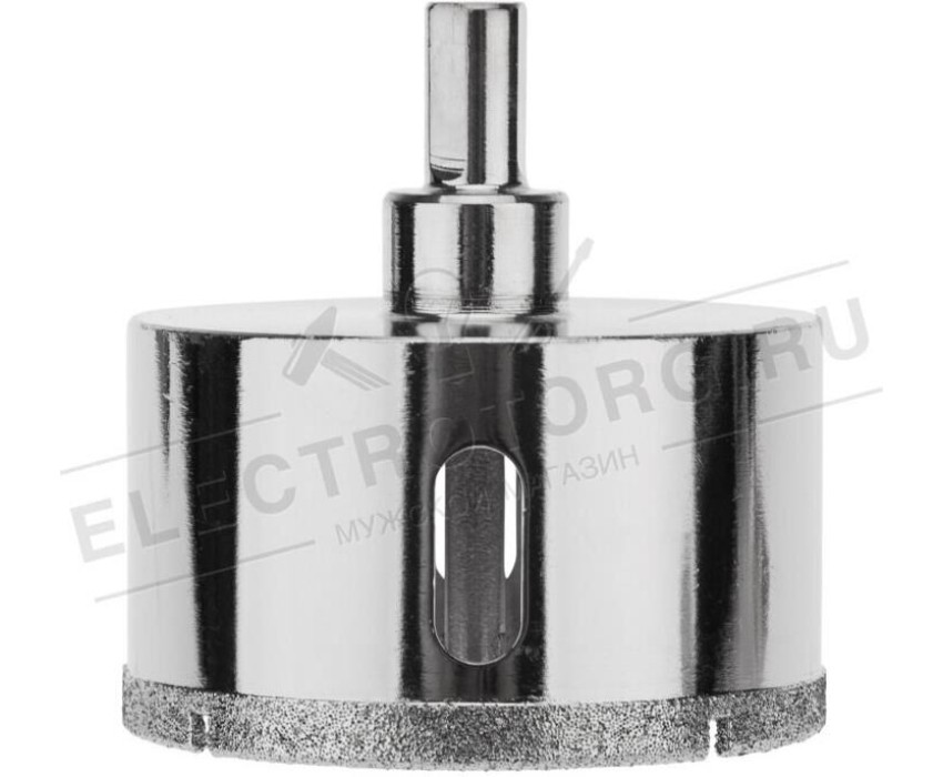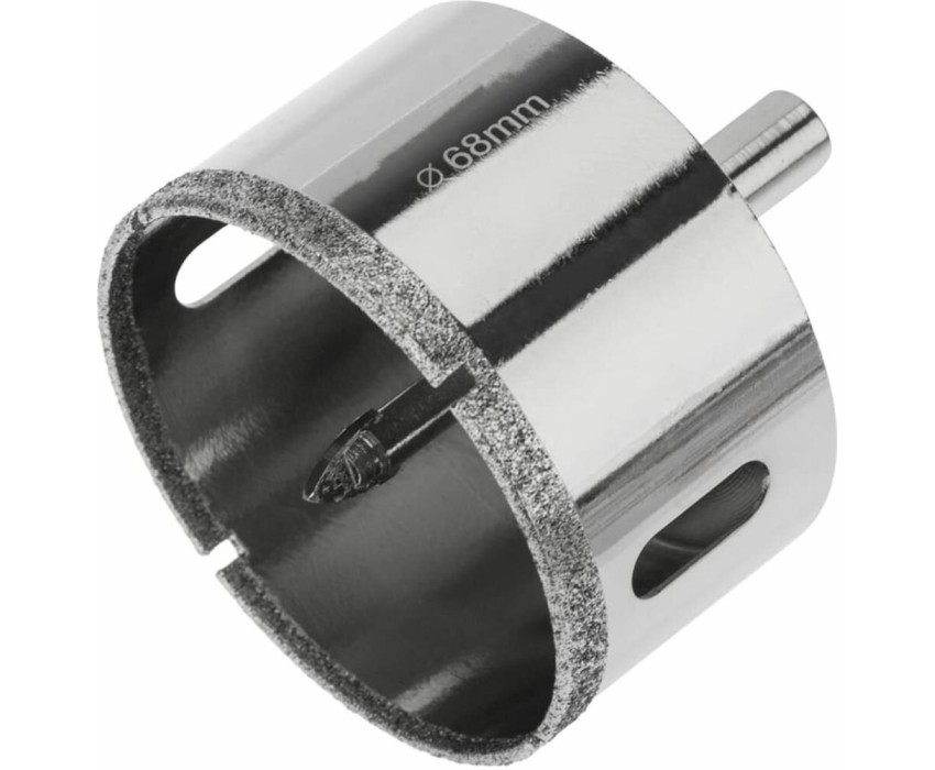 Алмазная коронка диаметром 68 мм используется при сверлении керамогранита, керамики, стекла. Наличие центровочного сверла обеспечивает точное позиционирование коронки на поверхности и помогает избежать смещения во время работ. Покрытие алмазной коронки выполнено гальваническим способом в два слоя, что обеспечивает эффективное сверление и продолжительный рабочий ресурс инструмента. Равномерное распределение алмазов по режущей кромке гарантирует аккуратное сверление материала без трещин и сколов. Высота алмазного слоя в 6 мм обеспечивает высокую производительность, а трехгранный хвостовик – надежную фиксации в патроне. При использовании алмазных коронок для сверления отверстий необходимо охлаждение, которое достигается путем подачи воды в рабочую зону.