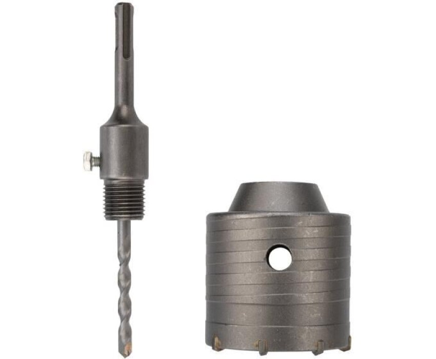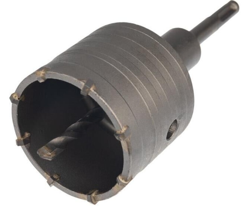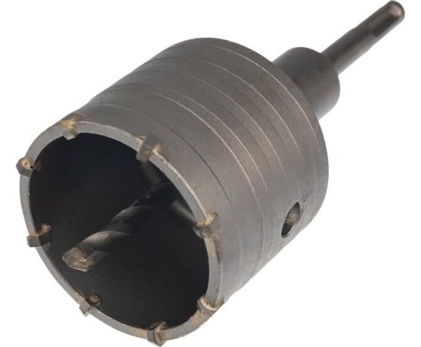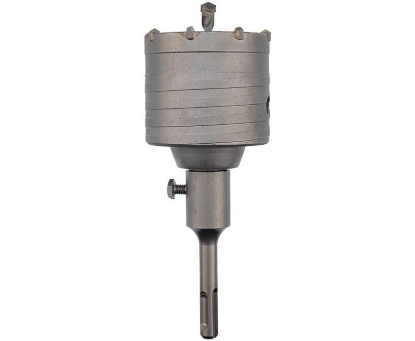 Коронка по бетону предназначена для сверления отверстий под трубы, розетки и выключатели в поверхностях из бетона, гранита, кирпича и камня при помощи перфораторов с патроном SDS PLUS. Корпус коронки изготовлен из углеродистой стали, а зубья и наконечник центрирующего сверла из твердого сплава ВК8, что гарантирует надежность и прочность оснастки. Спиральная канавка на внешней стороне коронки обеспечивает эффективный отвод шлама, снижая нагрузку на перфоратор. На коронку нанесено защитное консервирующее покрытие на масляной основе, обеспечивающее коррозионную стойкость. Коронка поставляется с центровочным сверлом и хвостовиком. Посадочный диаметр сверла (М22).
