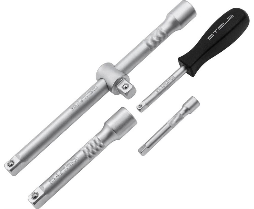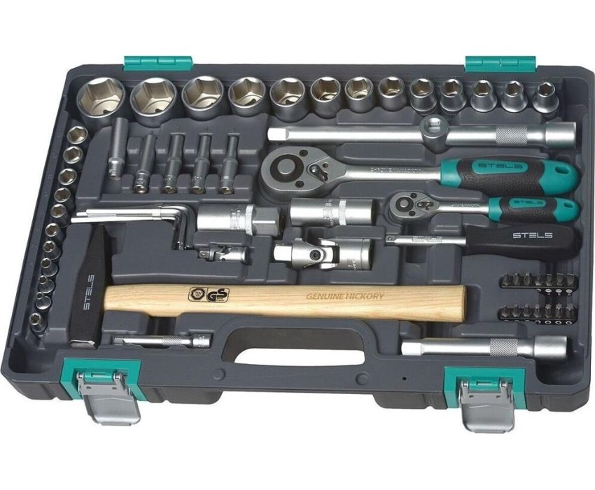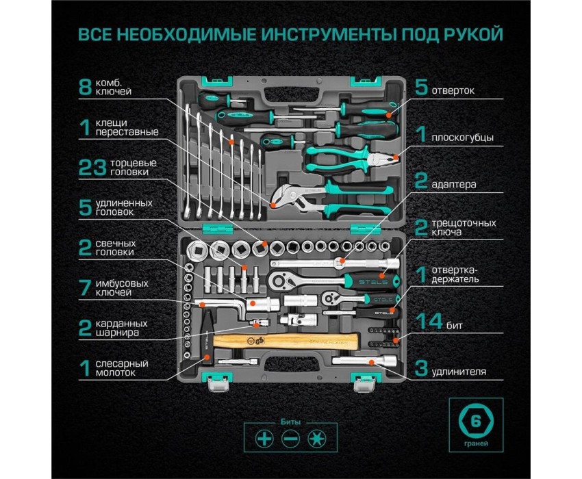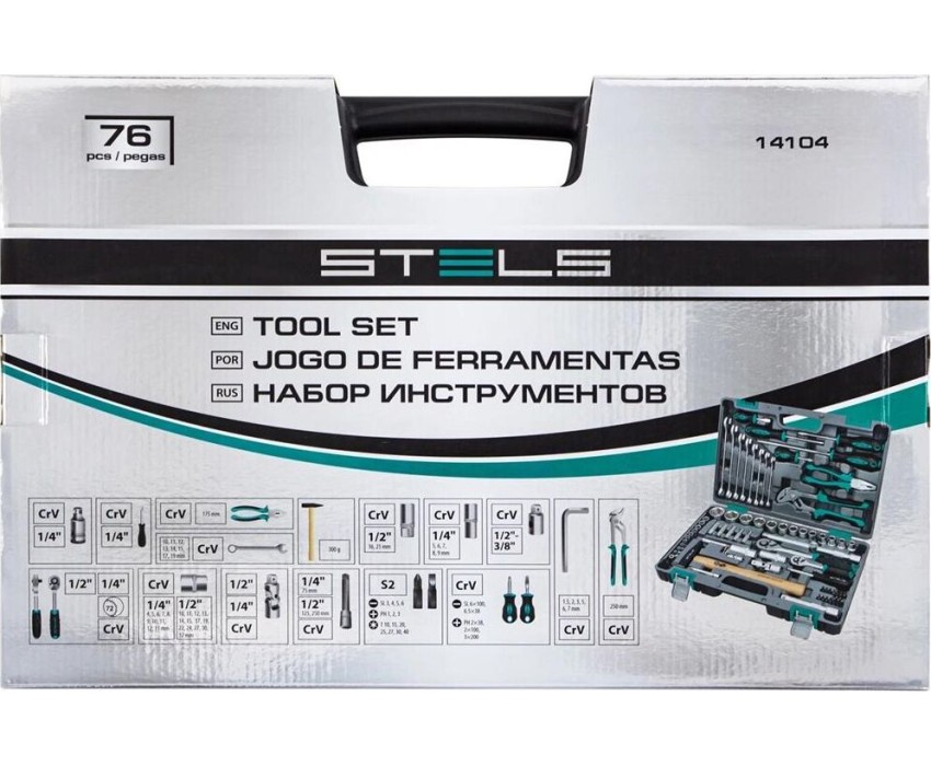 CrV, 1/4", Набор инструментов STELS 1/2", долговечной. Биты и отвертки выполнены из стали марки S2. Кейс служит для хранения и переноски инструментов., стойкой к нагрузкам, каждый из них изготовлен из высококачественной хромованадиевой стали, а также для проведения ремонта дома и на даче. В наборе 76 предметов, который подходит для технического обслуживания автомобиля, 76 предметов 14104 - это многофункциональный комплект, пластиковый кейс