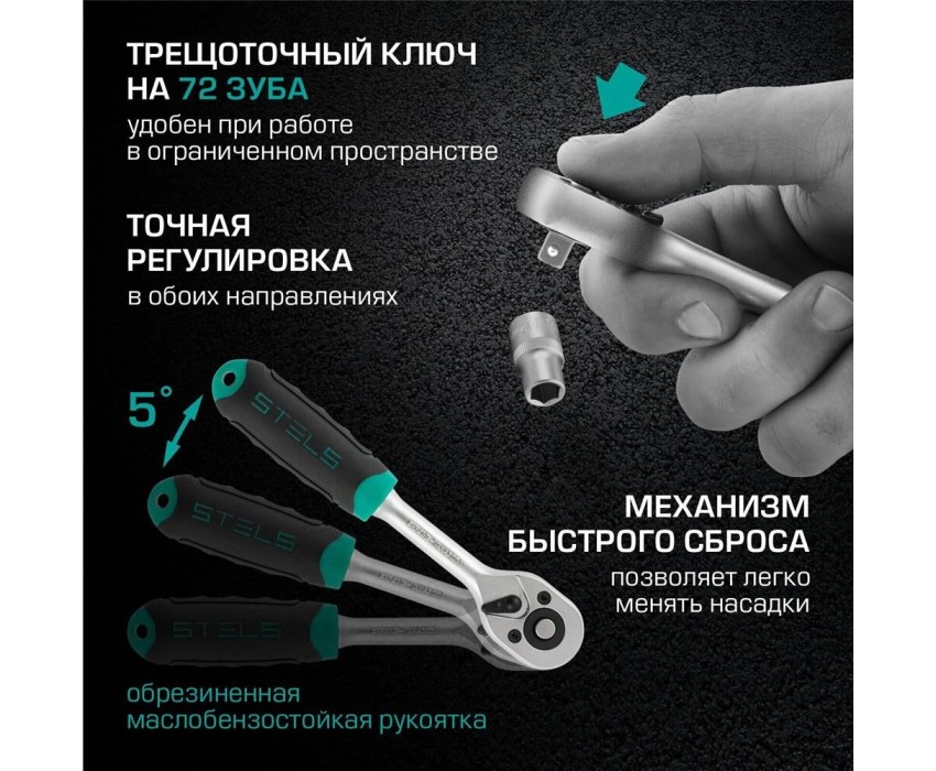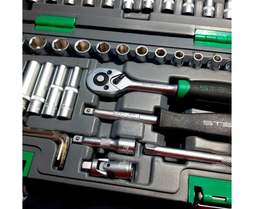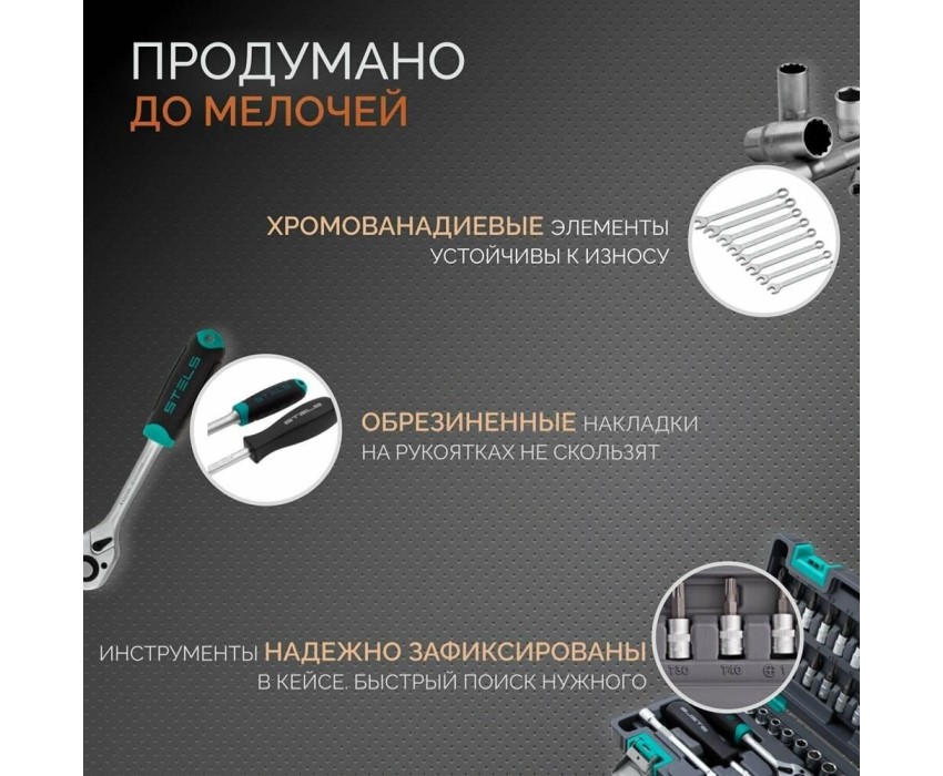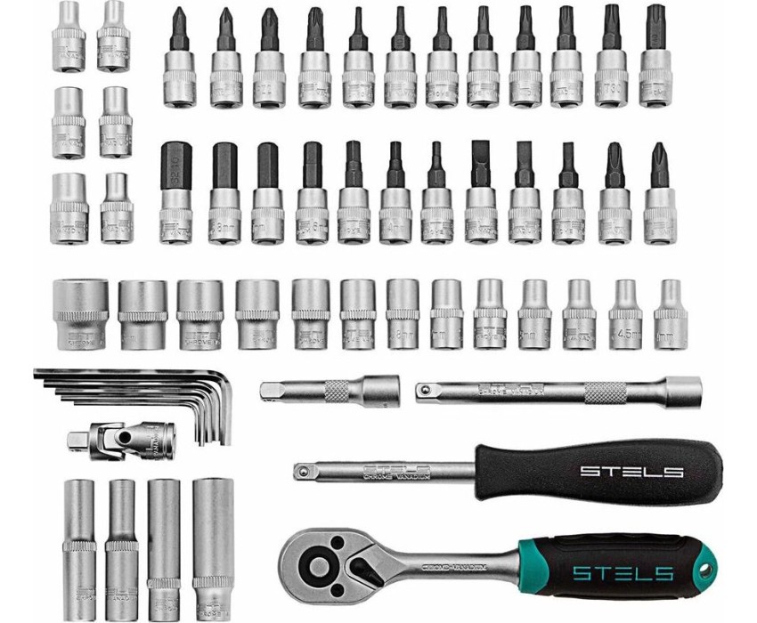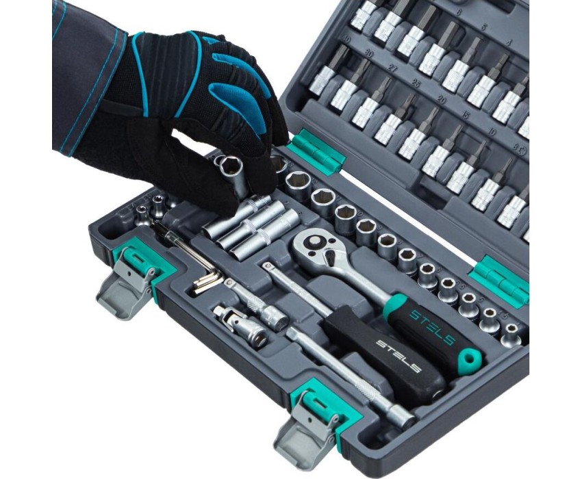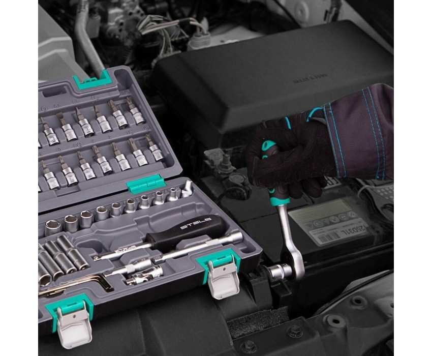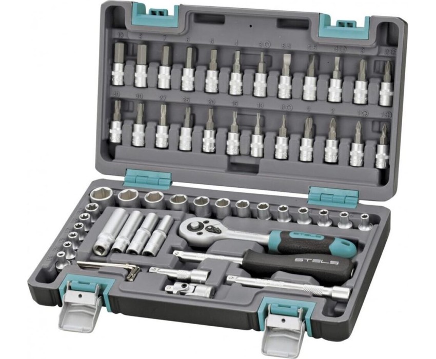 монтировать и демонтировать резьбовые соединения. Комплект из 57 инструментов поставляется в ударопрочном пластиковом кейсе. Все изделия выполнены из высокопрочной хромованадиевой стали. Двухкомпонентная рукоятка у трещоточного ключа обеспечивает комфортную работу и надежное удержание., обслуживать автомобиль, Набор инструментов STELS 1/4 CrV пластиковый кейс 57 предметов 14101 позволяет проводить бытовой ремонт дома