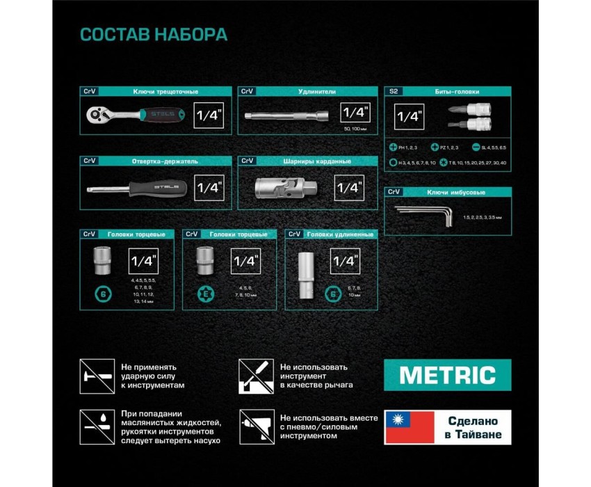 Набор инструментов STELS 57 предметов 14101 позволяет проводить бытовой ремонт дома, обслуживать автомобиль, монтировать и демонтировать резьбовые соединения. Комплект из 57 инструментов поставляется в ударопрочном пластиковом кейсе. Все изделия выполнены из высокопрочной хромованадиевой стали. Двухкомпонентная рукоятка у трещоточного ключа обеспечивает комфортную работу и надежное удержание. Технические характеристики набора инструментов STELS 14101 Количество в наборе, шт 57 Присоединительный размер 1/4 дюйма Тип головок 6-гранные Количество граней 6 Система измерения метрическая Min размер головки, мм 4 Max размер головки, мм 14 Комбинированные ключи нет Трещотка есть Torx есть Материал кейса пластик Свечной ключ нет Свечные головки нет Вес, кг 1.633 Дюймовые головки в комплекте нет Тип ключа нет Посадочный квадрат трещотки 1/4 дюйма
