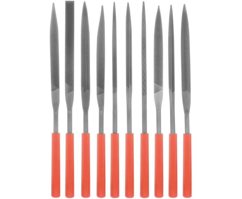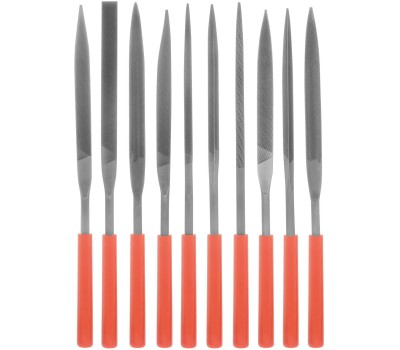 Набор надфилей Matrix 15824 размером 180 х 5 мм, с пластиковыми рукоятками, состоит из 10 инструментов для опиловки и зачистки мелких деталей. Входящие в комплект надфили имеют разные профили, благодаря чему подходят для обработки изделий сложной формы. Набор будет полезен при проведении слесарных и столярных работ, пригодится также дома или в гараже. Преимущества Долговечность — надфили изготовлены из конструкционной подшипниковой стали, поэтому характеризуются высокой износостойкостью. Высокое качество обработки — на полотна нанесена двойная перекрестная насечка. Комфорт во время работы — инструменты имеют удобные пластиковые рукоятки. Удобный поиск — благодаря красному цвету рукояток надфили не затеряются в рабочем пространстве.