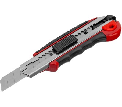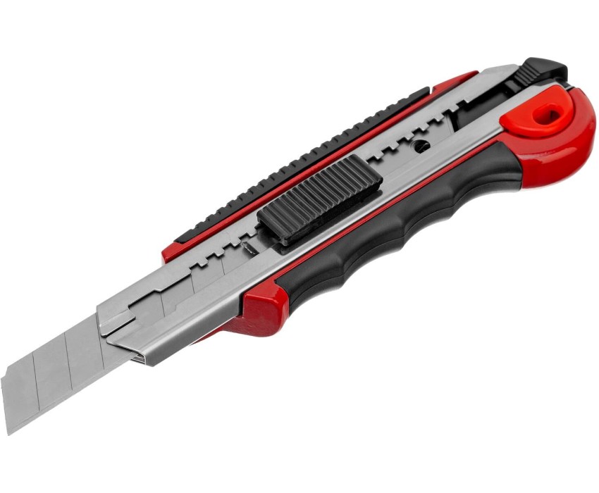 Нож Matrix 78921 с выдвижным лезвием шириной 18 мм, металлической направляющей, обрезиненной ручкой и 5 лезвиями в комплекте, используется для резки отделочных материалов (обоев, линолеума), а также картона, бумаги, пленки, скотча. Выдвижное полотно закрепляется в рабочем положении автоматически, а металлическая направляющая придает прочность конструкции и обеспечивает долговечность инструмента. Предусмотрена возможность замены лезвий. Нож подходит как для бытового, так и для профессионального применения. Преимущества Прочность — полотно толщиной 0,5 мм изготовлено из высокоуглеродистой стали 60. Дополнительная фиксация винтом — во время работы лезвие остается в заданном положении. Быстрое восстановление работоспособности — затупившийся сегмент отламывается, затачивать полотно не нужно. Продуманная конструкция — замена лезвий происходит мгновенно при помощи автоматического механизма. Удобная комплектация — нож поставляется с 5 сменными полотнами, хранящимися в обойме внутри корпуса. Эргономичность — благодаря резиновым вставкам на корпусе нож удобно ложится в руку.