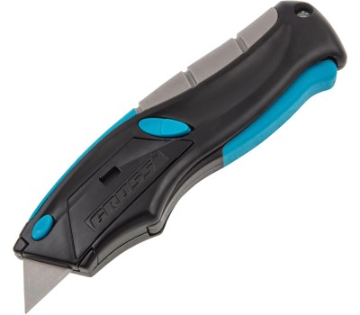 Ремонтно-монтажный нож пистолетного типа Gross 78870 длиной 170 мм, с трехкомпонентной рукояткой, автовыбросом/возвратом лезвия и 5 запасными лезвиями, применяется для разрезания линолеума, картона, кожи и других материалов. Лезвия изготовлены из высокопрочной японской стали SK-2, поэтому не ломаются и долго не тупятся. Инструмент предназначен для профессиональных работ, но может использоваться и в быту. Преимущества Удобное использование — полотно выдвигается при нажатии на курок и фиксируется в рабочем положении, а для его возврата нужно нажать на кнопку. Высокий ресурс — трапециевидное лезвие имеет режущие кромки с двух сторон, и для восстановления работоспособности достаточно его перевернуть. Прочность — трехкомпонентная рукоятка выдерживает механические нагрузки, поэтому нож подходит для частого использования. Быстрая и безопасная замена лезвия — изношенное полотно извлекается одним нажатием на специальную кнопку. Расходники в комплекте — к ножу прилагается 5 запасных полотен, которых хватит надолго. Продуманное хранение расходников — сменные полотна размещаются в отсеке внутри корпуса, поэтому они не потеряются и всегда будут под рукой.