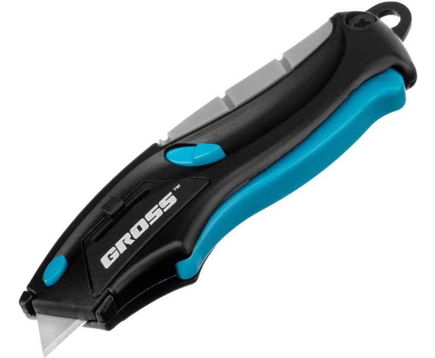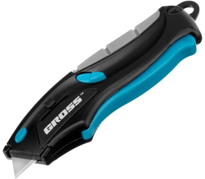 GROSS Нож ремонтно-монтажный мини, трехкомпонентная рукоятка, авто выброс, возврат лезвия, 100 мм, 2 запасных лезвия 78873