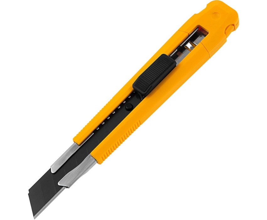 Нож Denzel 78940 со сменным лезвием шириной 18 мм, изготовленным из стали SK4, оснащен нажимным фиксатором, металлической направляющей и клипсой-держателем. Сверхострое выдвижное лезвие легко режет линолеум, ковролин, бумагу, обои, картон и другие листовые материалы. Нож рекомендован для профессионального применения, пригодится также в домашнем хозяйстве. Благодаря сегментной структуре полотна можно быстро восстановить работоспособность ножа: достаточно отломить затупившийся сегмент по линии насечки при помощи плоскогубцев или другого шарнирно-губцевого инструмента. При обламывании необходимо использовать средства индивидуальной защиты (очки и перчатки). Преимущества Прочность и износостойкость — лезвие изготовлено из японской инструментальной стали SK4, режущая кромка твердостью 65 HRC долго сохраняет остроту. Надежность — благодаря металлической направляющей лезвие не сломается даже при высоких нагрузках. Удобное использование — нажимной фиксатор удерживает лезвие в нужном положении. Дополнительные возможности — при помощи клипсы нож можно закрепить на поясном ремне. Комфортная работа — корпус из ABS-пластика удобно ложится в руку.