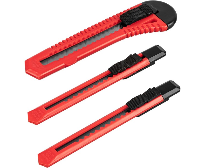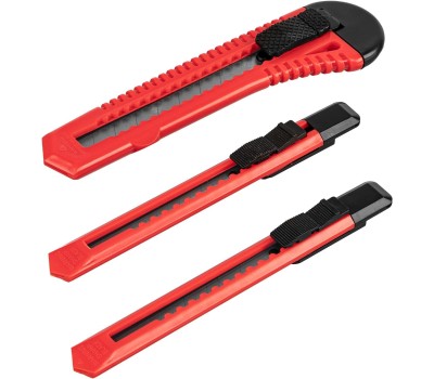 Набор Matrix 78985 состоит из 3 ножей с выдвижными лезвиями шириной 9-9-18 мм. Ими режут материалы, работа с которыми не требует особых усилий — картон, бумагу, обои, линолеум. Лезвия выдвигаются на необходимую длину в зависимости от толщины материала. Набор рекомендован для бытового использования. Преимущества Прочность и износостойкость — лезвия изготовлены из высокоуглеродистой стали 60. Быстрое восстановление режущей способности — достаточно отломить затупившийся сегмент полотна. Простая замена полотен — новое лезвие вставляется через хвостовую часть инструмента.