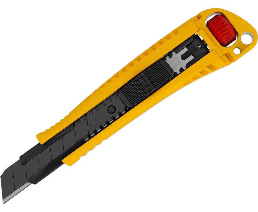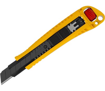 Нож Denzel 78904 выполнен в корпусе из цинкового сплава с вставкой из термопластичной резины TPR, оснащен сменным лезвием шириной 18 мм, изготовленным из стали SK4 по технологии UltraSharp, и торцевым зажимом. Сверхострое выдвижное лезвие легко режет линолеум, ковролин, бумагу, обои, картон и другие листовые материалы. Нож будет полезен для проведения профессиональных ремонтных и отделочных работ, пригодится также в домашнем хозяйстве. Благодаря сегментной структуре полотна работоспособность ножа быстро восстанавливается: достаточно отломить затупившийся сегмент по линии насечки при помощи плоскогубцев или другого шарнирно-губцевого инструмента. Во избежание травм при обламывании необходимо использовать средства индивидуальной защиты (очки и перчатки)! Преимущества Прочность и износостойкость — лезвие изготовлено из японской инструментальной стали SK4, режущая кромка твердостью 65 HRC долго сохраняет остроту. Лазерная закалка лезвий UltraSharp — позволяет сделать заточку более острой и при этом долговечной. Повышенная прочность — за счет увеличенного количества материала корпуса (цинковый сплав + TPR) можно работать со значительным усилием без риска поломки ножа. Надежность — благодаря металлической направляющей лезвие не сломается даже при интенсивном использовании. Выполнение тяжелых и точных работ — лезвие жестко фиксируется при помощи дополнительного торцевого зажима. Комфортная работа — корпус с прорезиненной вставкой не выскальзывает из руки.