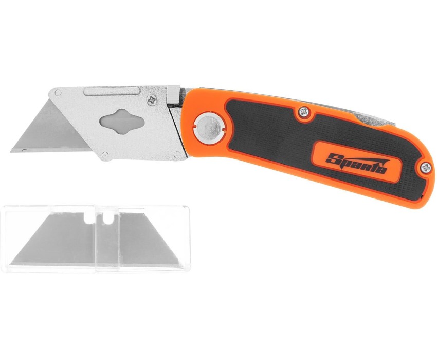 Складной нож Sparta 78981 с пластиковой двухкомпонентной рукояткой и 5 сменными трапециевидными лезвиями пригодится для бытового использования, во время проведения ремонтных и строительных работ. За счет трапециевидного лезвия он легко режет заготовки из картона, линолеума, кожи и других плотных материалов. За счет складной конструкции нож удобен и безопасен в транспортировке и хранении. Преимущества Лезвия выполнены из прочной стали 60, поэтому прослужат долгое время. Двухкомпонентная рукоятка с прорезиненным покрытием обеспечивает надежный хват и повышает удобство работы. Нож укомплектован 5 запасными лезвиями, поэтому их не придется покупать дополнительно.