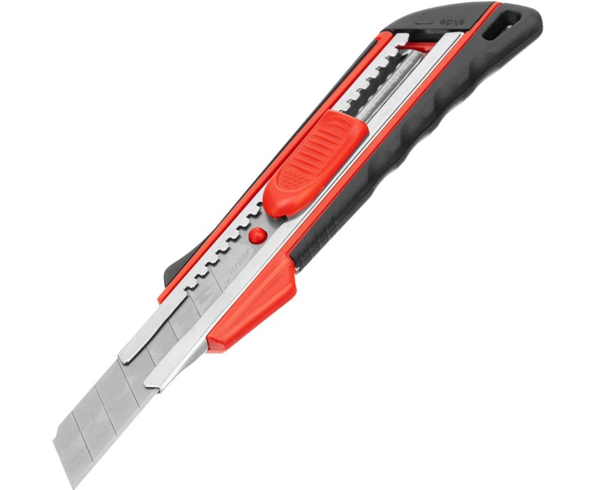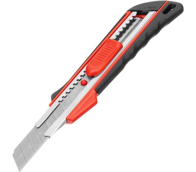 Нож Matrix 78933 с выдвижным лезвием шириной 18 мм, металлической направляющей и эргономичной двухкомпонентной рукояткой пригодится при выполнении ремонтных и строительных работ в мастерской и в быту. Он легко режет бумагу, картон, кожу, обои и другие материалы. Выдвижная конструкция позволяет с удобством эксплуатировать и безопасно перевозить нож. Преимущества Прочность и надежность лезвия обеспечивает сталь 60, из которой оно изготовлено. При необходимости лезвие легко меняется через хвостовую часть инструмента. Металлическая направляющая защищают корпус от повреждений даже при интенсивном использовании. На лезвие нанесены риски, поэтому при затуплении кромки достаточно отломать сегмент и продолжить использование ножа.
