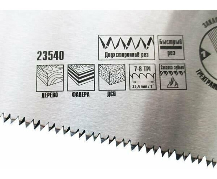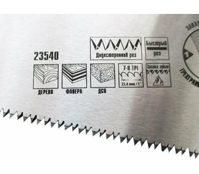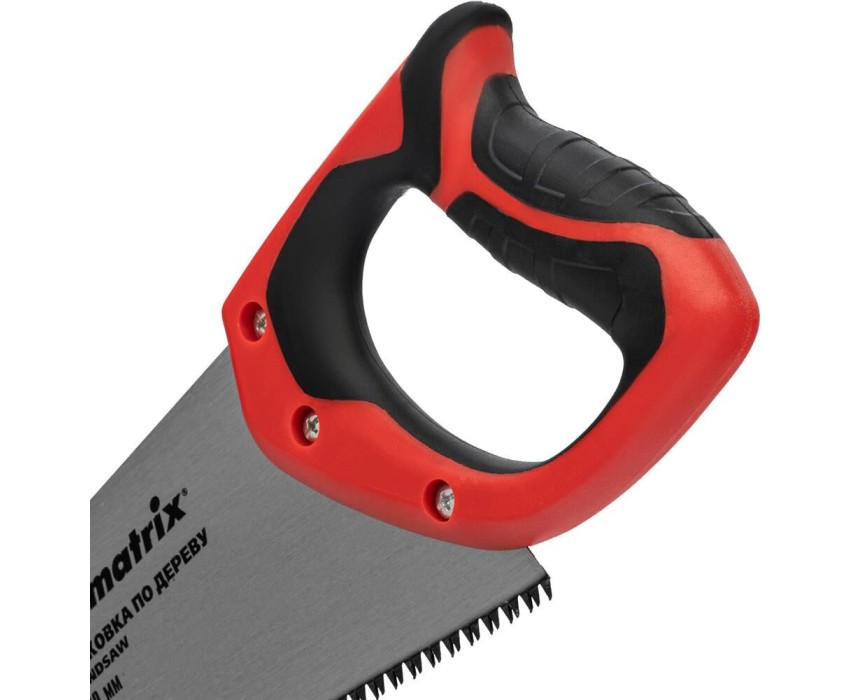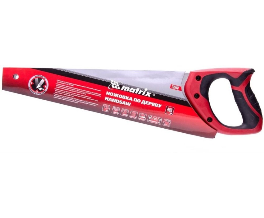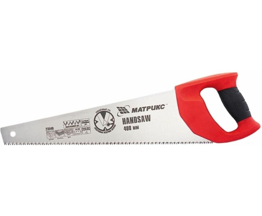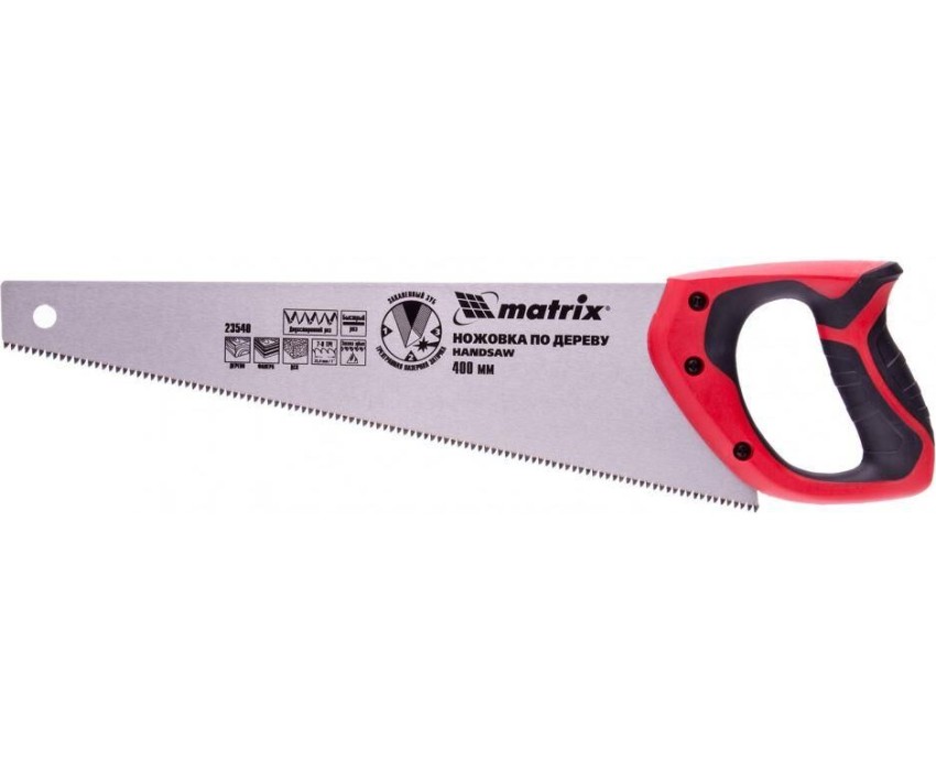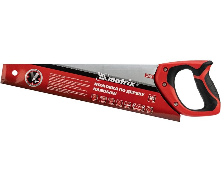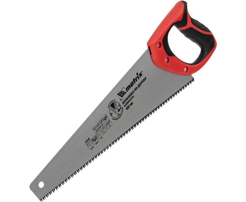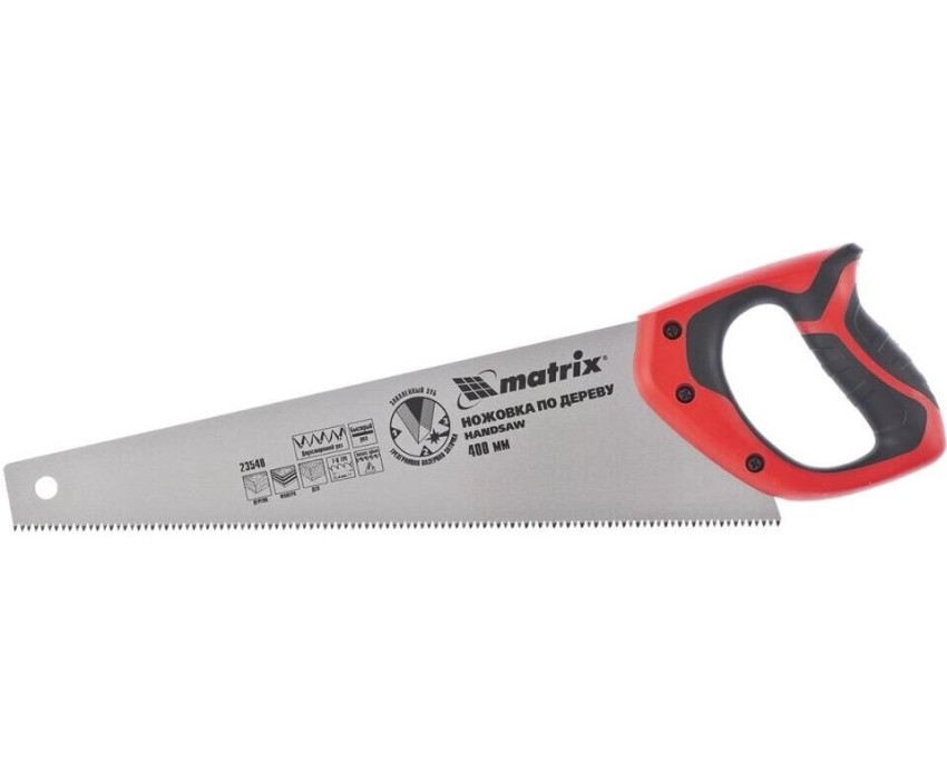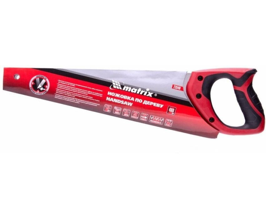Ножовка по дереву Matrix 23540 с полотном длиной 400 мм, с калеными зубьями с 3D-заточкой и шагом 7-8 TPI, с двухкомпонентной рукояткой, используется для продольного и поперечного пиления досок, брусков, листов фанеры, ДСП. Благодаря трехгранной заточке зубьев пила характеризуется высокой производительностью. Шаг зубьев составляет 7-8 TPI, что обеспечивает быстрый и качественный рез. Ножовка пригодится в столярной мастерской, а также будет полезна в хозяйстве.ПреимуществаМеханическая прочность — полотно изготовлено из холоднокатаной пружинной стали 65Mn, устойчивой к динамическим нагрузкам.Высокий рабочий ресурс — зубья закалены и имеют твердость 50-55 HRC.Коррозионная стойкость — на полотно нанесено защитное лаковое покрытие.Комфорт во время работы — эргономичная двухкомпонентная рукоятка с резиновыми вставками имеет усовершенствованный дизайн и удобно лежит в руке, снижая нагрузку на кисть при длительном пилении.Надежность — ножовка изготовлена на японском оборудовании и прошла строгий контроль качества.
