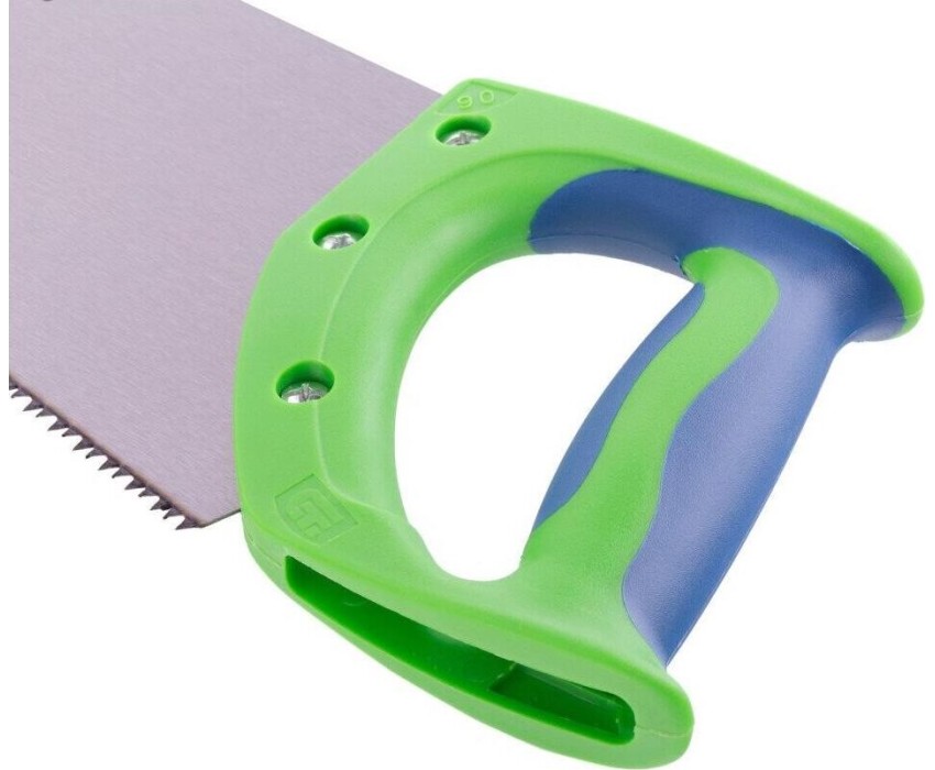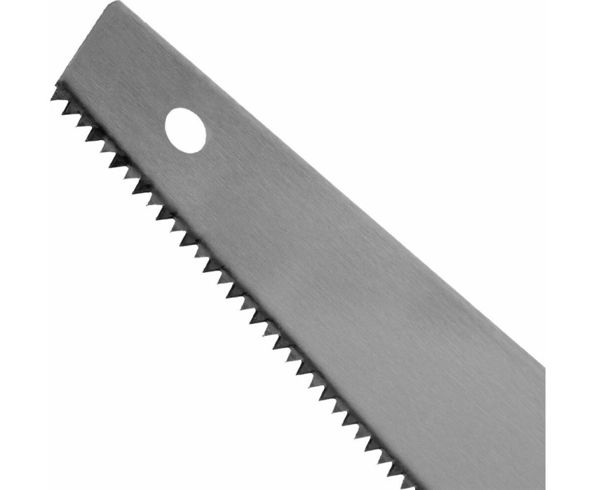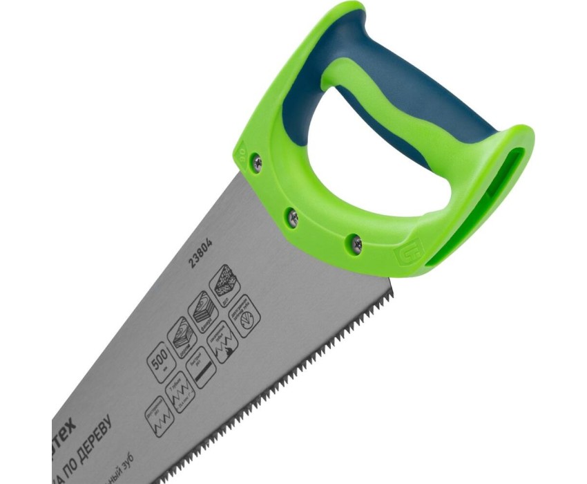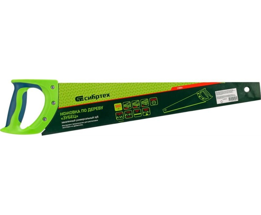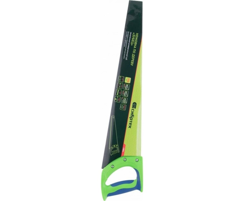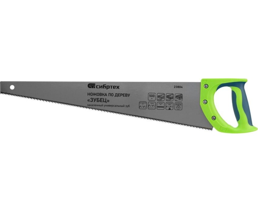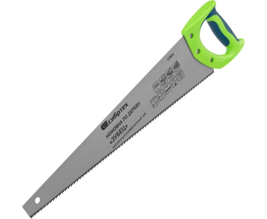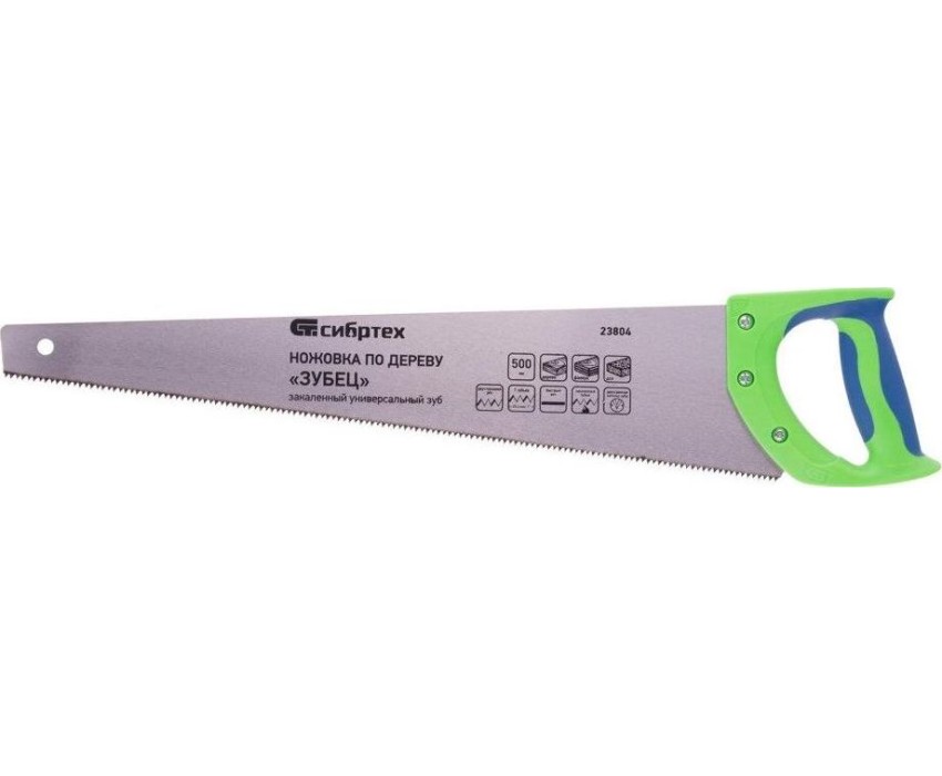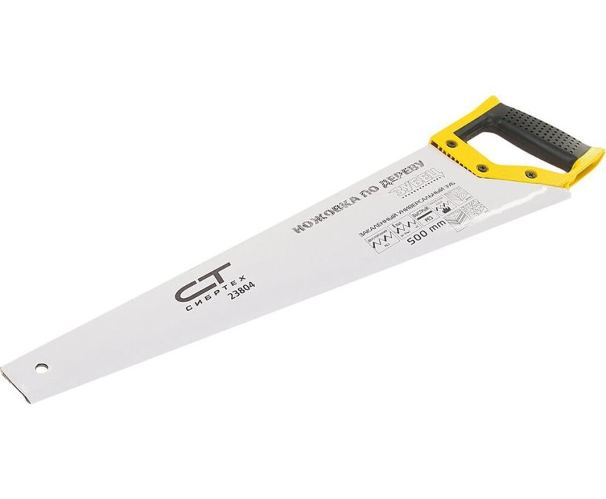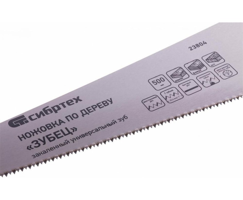 Ножовка по дереву Сибртех «Зубец» 23804 с полотном длиной 500 мм, калеными зубьями с 2D-заточкой и шагом 7 TPI, 2-компонентной рукояткой, используется для распиливания заготовок из древесины, фанеры и ДСП. Рабочая часть, содержащая 7 зубьев на дюйм, обеспечивает быстрый двусторонний рез. Режущую кромку можно перетачивать. Ножовка будет полезна столярам, плотникам и домашним мастерам.ПреимуществаПолотно изготовлено из пружинной стали 65Mn, поэтому выдерживает значительные нагрузки.Зубья прошли закалку, что обеспечивает инструменту высокий ресурс работоспособности.Поверхность полотна покрыта лаком, защищающим ее от коррозии.Рукоятка из ударопрочного пластика прикреплена к полотну 3 винтами, что придает конструкции надежность.Резиновые вставки на рукоятке препятствуют выскальзыванию ее из ладони, что повышает комфортность работы.