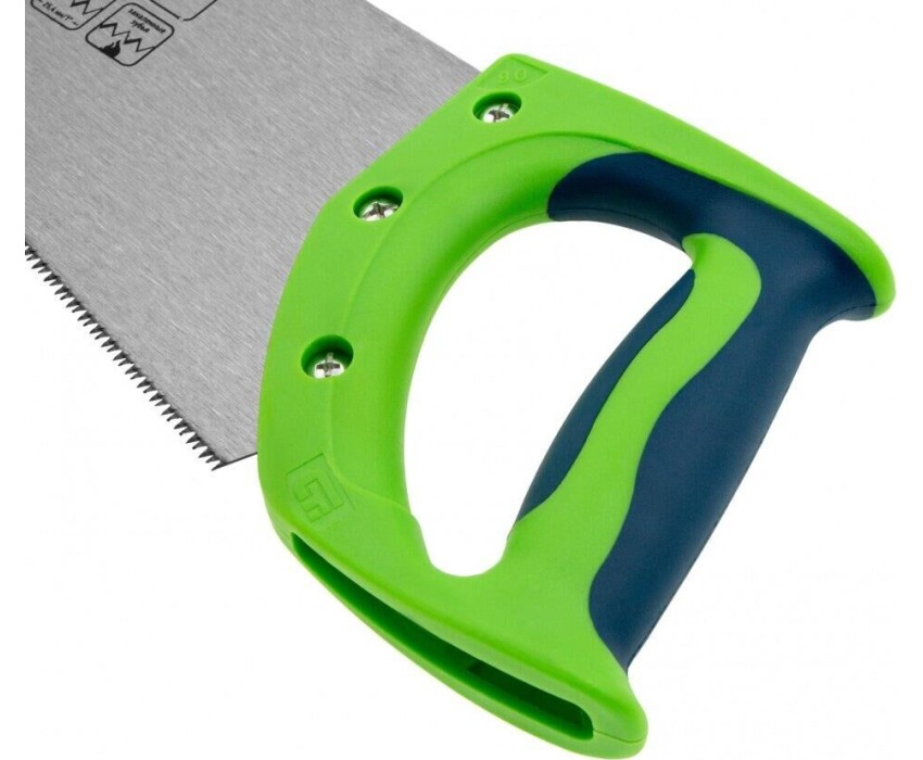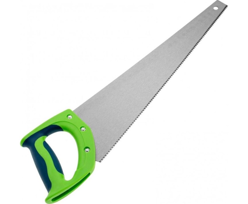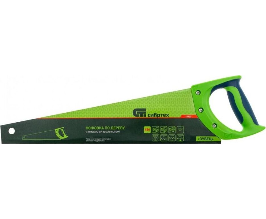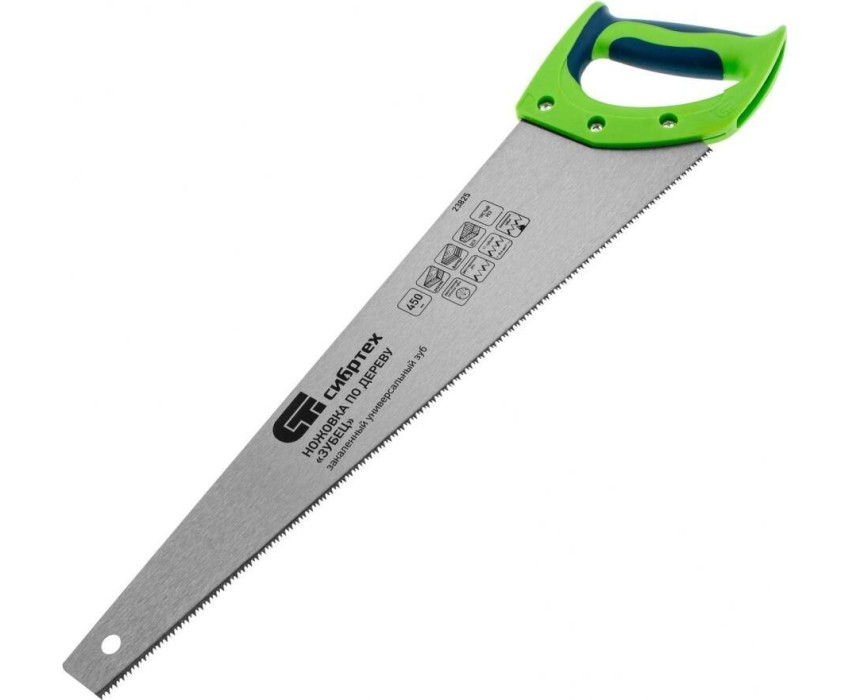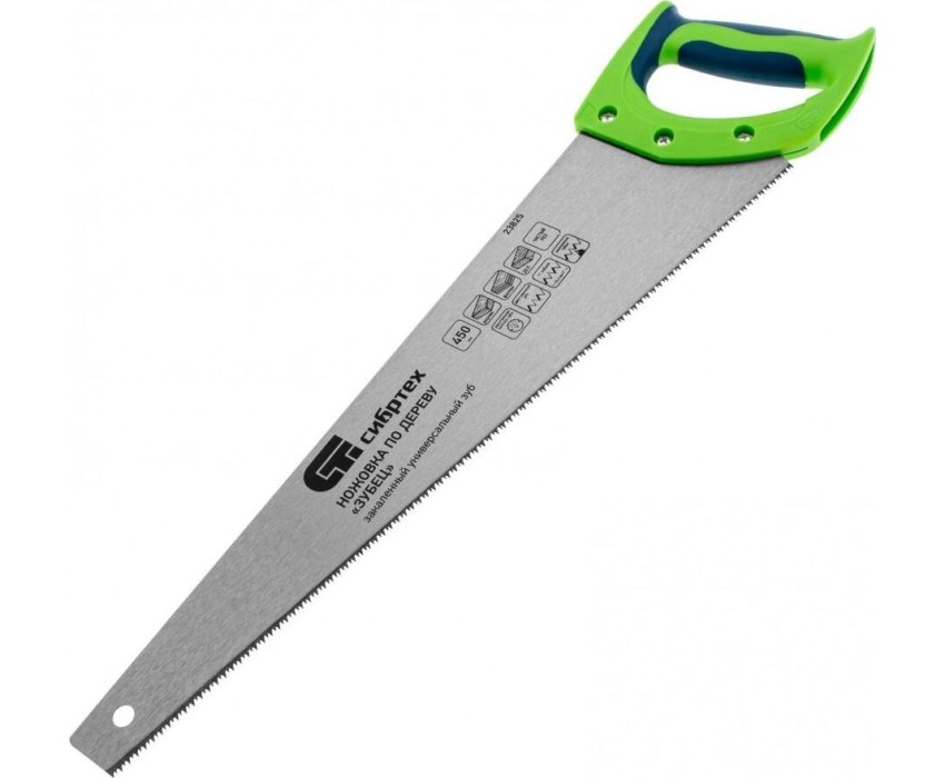 Ножовка по дереву Сибртех «Зубец» 23825 с полотном длиной 450 мм, калеными зубьями с 2D-заточкой и шагом 11 TPI, 2-компонентной рукояткой, используется для распиливания заготовок из древесины, фанеры и ДСП. Рабочая часть, содержащая 11 зубьев на дюйм, обеспечивает чистый двусторонний рез. Режущую кромку можно перетачивать. Ножовка будет полезна столярам, плотникам и домашним мастерам.ПреимуществаПолотно изготовлено из пружинной стали 65Mn, поэтому выдерживает значительные нагрузки.Зубья прошли закалку, что обеспечивает инструменту высокий ресурс работоспособности.Поверхность полотна покрыта лаком, защищающим ее от коррозии.Рукоятка из ударопрочного пластика прикреплена к полотну 3 винтами, что придает конструкции надежность.Резиновые вставки на рукоятке препятствуют выскальзыванию ее из ладони, что повышает комфортность работы.