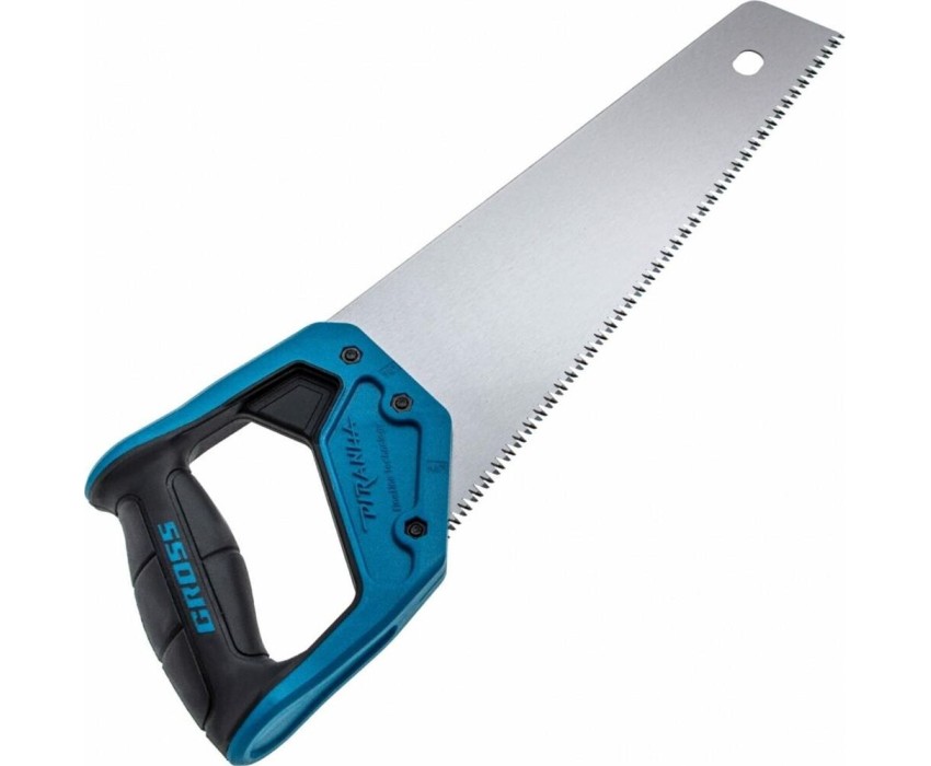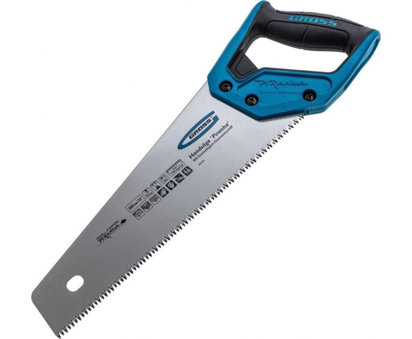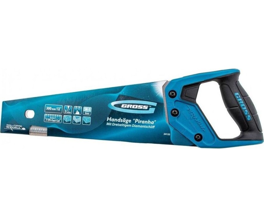 Ножовка по дереву Gross PIRANHA 24122 с полотном длиной 300 мм, калеными зубьями с 3D-заточкой и шагом 7 TPI, с 2-компонентной рукояткой, используется для распиливания древесины, МДФ, ДСП, ДВП, ламината, а также пенополистирола, полиуретана и других пластических материалов. Подходит для продольного и поперечного пиления. Зубья имеют универсальный шаг 7 TPI, поэтому ножовка подходит для решения широкого спектра задач. Трехгранная заточка зубьев обеспечивает максимальную производительность и высокое качество пиления. Ножовка предназначена для столярных и плотницких работ, пригодится во время ремонта и будет полезна в быту.ПреимуществаПолотно изготовлено из японской стали SK-5, обладающей высокими прочностными характеристиками.Зубья закалены токами высокой частоты, что обеспечивает повышенную износостойкость рабочей части.Закалка зубьев на 2/3 высоты уменьшает вероятность их слома при обработке древесины твердых пород.На полотно нанесено полимерное покрытие для защиты от коррозии.Рукоятка выполнена из ударопрочного ABS-пластика, что увеличивает срок службы инструмента.Благодаря эргономичной форме и рифленой поверхности рукоятка удобно ложится в руку и не скользит, обеспечивая комфорт во время интенсивной работы.Инструмент изготовлен на тайваньском заводе с соблюдением всех технологических требований, что гарантирует его надежность.