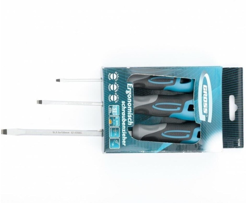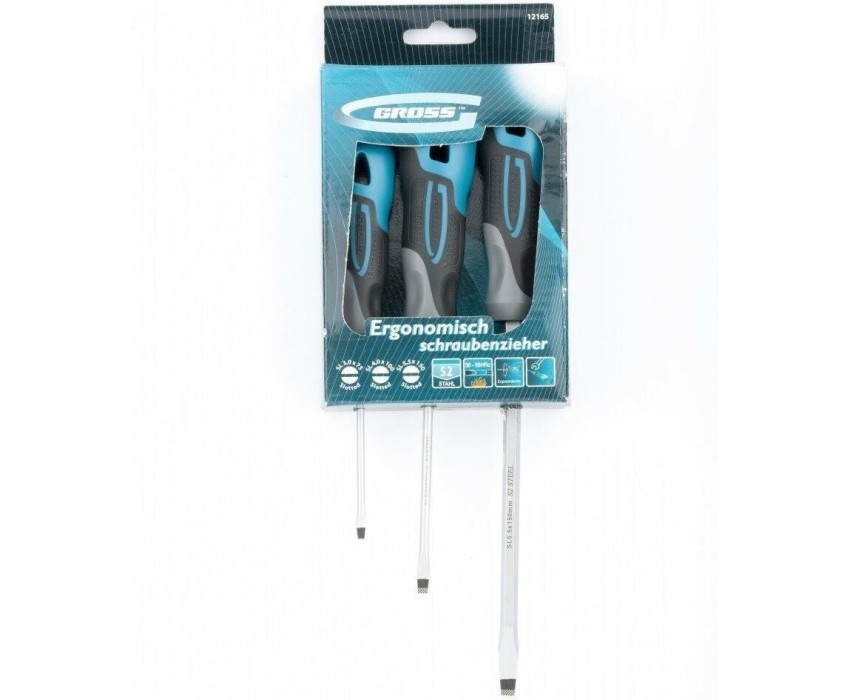 Набор из 3 отверток Gross 12165 из стали S2, с трехкомпонентными рукоятками, используется для монтажа и демонтажа крепежных элементов с профилем SL3, SL4 и SL5,5. Высокое качество отверток позволяет применять их для решения профессиональных задач с повышенными нагрузками. Отвертки в комплекте имеют стержни разной длины 75-150 мм для удобства работы с крепежом как на поверхности, так и в углублениях.ПреимуществаДолговечность — отвертки изготовлены из высококачественной инструментальной стали S2.Высокий ресурс — благодаря индукционной закалке твердость рабочих частей составляет 56-58 HRC, что обеспечивает им устойчивость к износу.Удобство эксплуатации — специальные насечки и фосфатное покрытие шлицов обеспечивают улучшенное сцепление с крепежом, предотвращая его повреждение.Коррозионная стойкость — хромовое покрытие стержней отверток продлевает срок их службы.Намагниченные наконечники — крепежи надежно удерживаются на шлице отверток, поэтому их удобно направлять в отверстие одной рукой, придерживая закрепляемую