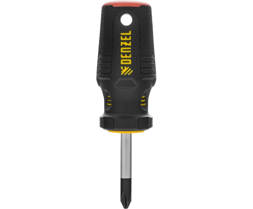 Отвертка Denzel 121867 с трехкомпонентной рукояткой, со стержнем из стали S2, длиной 38 мм, предназначена для закручивания и откручивания резьбового крепежа типа PH2. Удобна для работы в ограниченном пространстве. Высокоточный намагниченный шлиц избавляет мастера от необходимости придерживать винт или саморез рукой. Отвертка рекомендована для профессионального использования. Преимущества Прочность — стержень изготовлен из стали S2 и закален до твердости 61 HRC. Износостойкость и защита от коррозии — шлиц фосфатирован, на стержень нанесено никелевое покрытие. Работа в сложных условиях — трехкомпонентная рукоятка обладает масло- и бензостойкостью. Быстрый поиск нужного инструмента — на затыльнике имеется цветовая маркировка, позволяющая определить типоразмер отвертки. Комфортная эксплуатация без усталости — эргономичная рукоятка с резиновыми вставками и подпальцевыми выемками не выскальзывает из ладони. Удобное хранение — отверстие в рукоятке позволяет подвешивать отвертку на крючок или скобу.