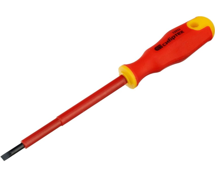 Диэлектрическая отвертка Сибртех 12932, SL4 х 100 мм, из стали CrV, с двухкомпонентной рукояткой, используется для монтажа/демонтажа крепежных элементов типа Slotted «минус». Отвертка рассчитана на полупрофессиональное применение: замену розеток, подключение электросчетчиков и т.д. Длина стержня 100 мм удобна для работы с крепежом на поверхности и в углублениях. Внимание — техника безопасности запрещает выполнять работы под напряжением! Преимущества Стержень из легированной закаленной хромованадиевой стали обеспечивает высокий ресурс и прочность отвертки. На рукоятку нанесен калибр шлица отвертки, таким образом легко найти нужный инструмент. Двухкомпонентная рукоятка рельефной формы повышает комфорт работы, т.к. не проскальзывает и удобно лежит в руке. В рукоятке имеется отверстие, благодаря чему отвертку можно подвешивать для компактного хранения.
