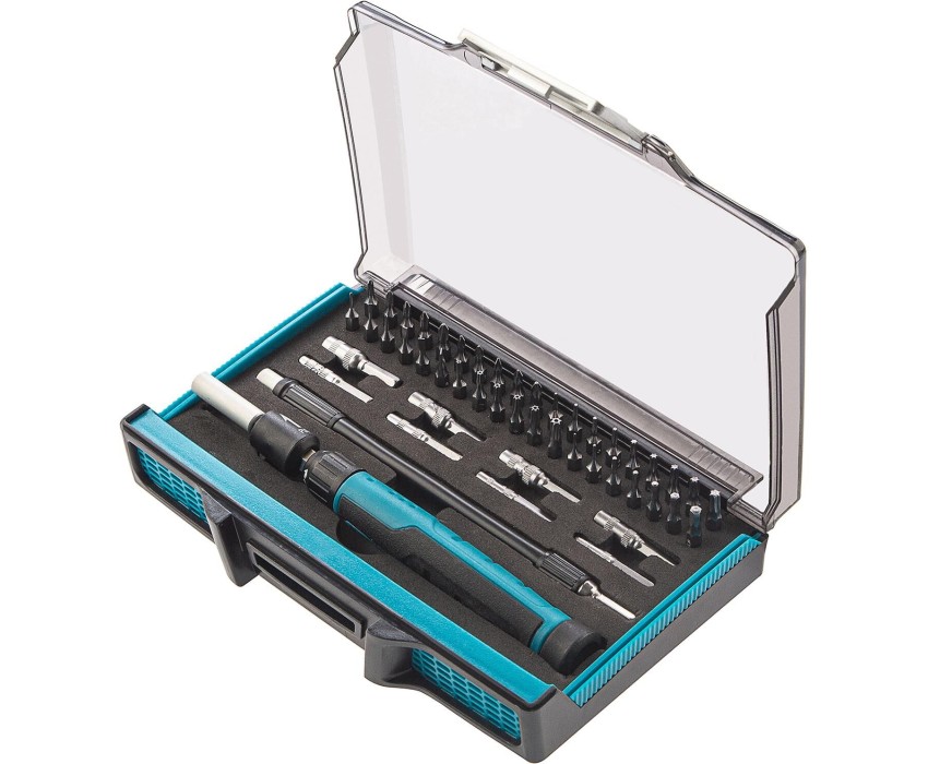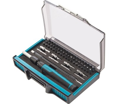 Отвертка с набором бит и торцевых головок Gross 11599, с гибким приводом, 48 предметов из стали CrMo, рассчитана на осуществление точных работ. С ее помощью можно отремонтировать очки, игрушки, портативную и бытовую технику и т.д. К отвертке прилагаются выдвижной стержень и гибкий удлинитель, позволяющие работать с мелкими деталями в углублениях и труднодоступных местах. Преимущества Насадки изготовлены из стали CrMo и закалены до твердости 54-56 HRC, что обеспечивает их износостойкость и долговечность. Реверсивный механизм значительно повышает скорость работы. Вращающийся затыльник обеспечивает более удобную работу с микровинтами. Намагниченные биты позволяют легко доставать металлический крепеж из углублений и насаживать его одной рукой. Отверткой комфортно работать за счет эргономичной двухкомпонентной рукоятки. Пластиковый жесткий кейс с защелкой позволяет с удобством транспортировать и безопасно хранить набор.