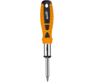Реверсивная отвертка Sparta 115455 с набором бит из стали CrV, входит в комплект из 10 предметов и используется для закручивания и откручивания резьбовых крепежей. Храповый механизм позволяет обойтись без перехватывания ручки и переставления шлица, что значительно ускоряет и упрощает работу. В наборе 9 бит самых популярных размеров со шлицами SL, PH, PZ. Комплект рекомендован для бытового применения и будет полезен при сборке мебели, ремонте бытовой техники, пригодится также и в гараже. Преимущества Прочность и долговечность — биты изготовлены из стали хромованадиевой группы, характеризующейся высокой износостойкостью. Закручивание и откручивание крепежей — на корпусе имеется рычажок-переключатель реверса, позволяющий менять направление вращения. Удобное хранение — биты поставляются на плашке-держателе, поэтому они не потеряются. Универсальность — присоединительный шестигранник размером 1/4 дюйма совместим со стандартными битами всех производителей. Комфорт во время эксплуатации — эргономичная двухкомпонентная ручка удобно лежит в руке и не скользит, снижая усталость при длительной работе. Удобство при транспортировке — отвертка с битами гораздо компактнее набора стандартных отверток, и ее проще перевозить.