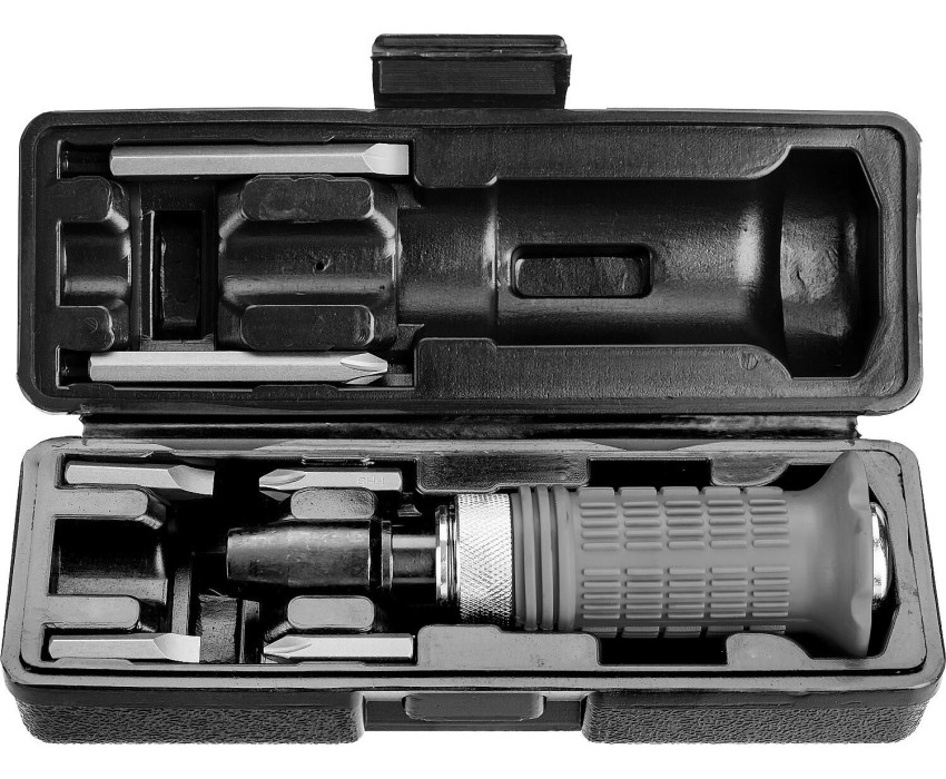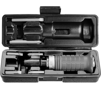 Ударно-поворотная отвёртка соответствует высоким техническим требованиям. Позволяет легко открутить прикипевший крепеж Преимущества Эргономичная рукоятка обеспечивает надежный хват Реверс позволяет как откручивать, так и закручивать крепеж Биты в наборе изготовлены из высокопрочной хромованадиевой стали. Работа как с ударными битами с хвостовиком 5/16”, так и с ударными головками с присоединительным квадратом 1/2” Использование Для монтажа и демонтажа резьбовых соединений