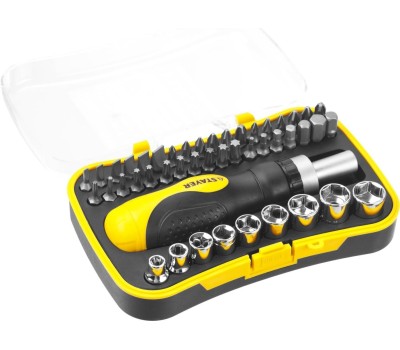 Набор хромованадиевых бит и торцовых головок с реверсивной отверткой разработан для монтажа и демонтажа резьбовых соединений в соответствии с высочайшими требованиями профессионалов Преимущества Материал бит - сталь Cr-V Высокая твердость и точность шлица бит Набор торцовых головок Высокопрочный трехпозиционный реверсивный механизм отвертки Компактный кейс для удобства хранения Использование Для монтажа, демонтажа резьбовых соединений
