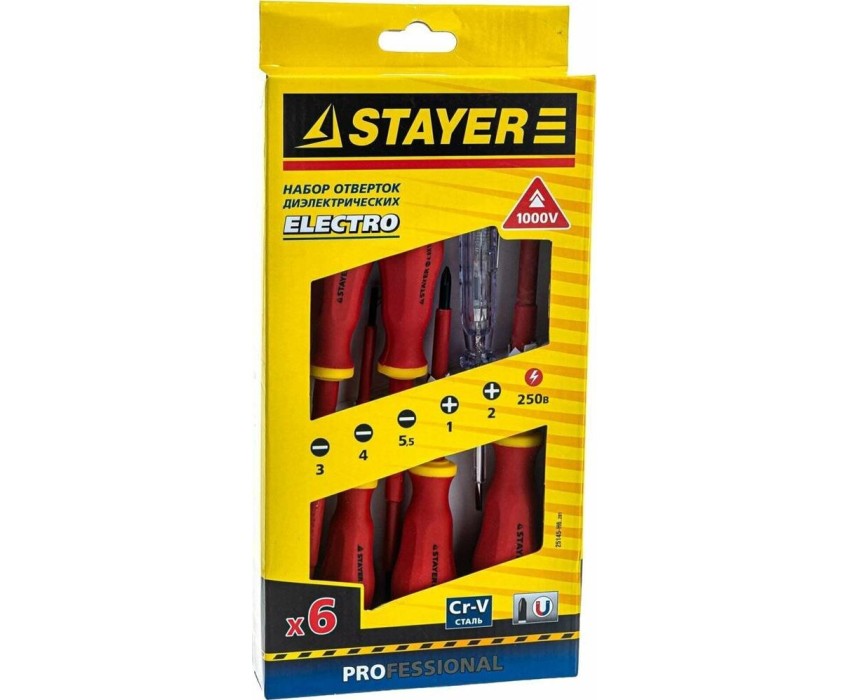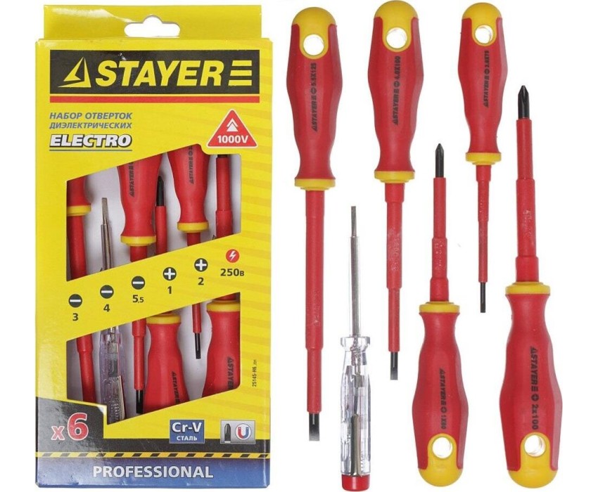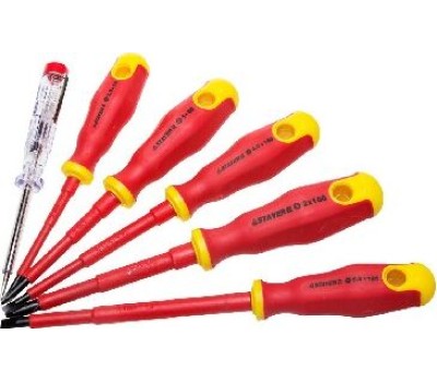 Набор диэлектрических отверток 8 шт. STAYER ELECTRO 25145-H8_z01 - комплект для работ под напряжением до 1000 В, когда необходимо закрутить или выкрутить шурупы и гайки. Для безопасности стержень покрыт изолирующим материалом. В поставку входит отвертка-тестер. Благодаря специальной форме рукоятки исключено выскальзывание инструмента в процессе работы. Технические характеристики набора отверток STAYER 25145-H8_z01 Тип наконечника Phillips (PH)/Slotted (SL) Материал рукояти двухкомпонентный Диэлектрическое покрытие есть Намагниченный наконечник да Ударная нет Для точных работ нет Форма ручки Прямая Количество в наборе, шт 8 Трещоточный механизм нет Материал стержня CrV Тип шлица SL 3-4-5-7; PH 0-1-2