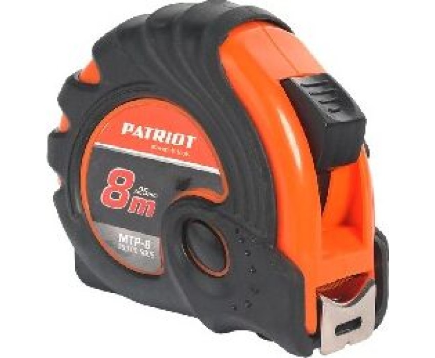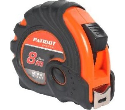 Рулетка PATRIOT MTP-8, ударопрочный корпус, обрезиненная, 8м. Прорезиненный эргономичный корпус выполнен из ударопрочного пластика. Широкая кнопка блокировки движения ленты для удобства и комфорта. Боковая кнопка фиксации ленты для дополнительного удобства и контроля.