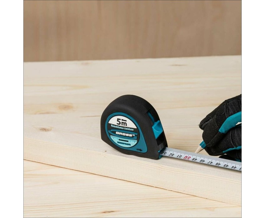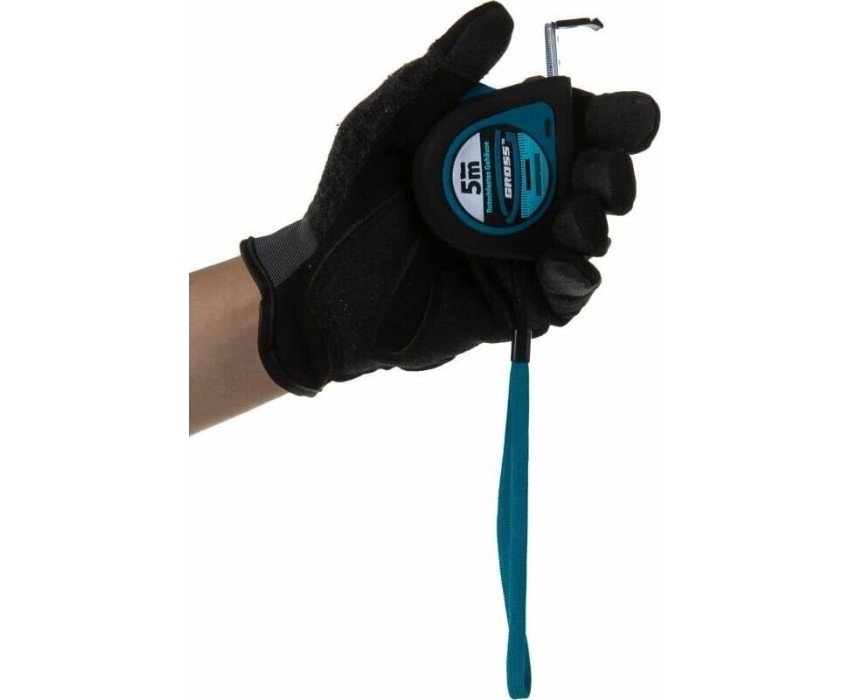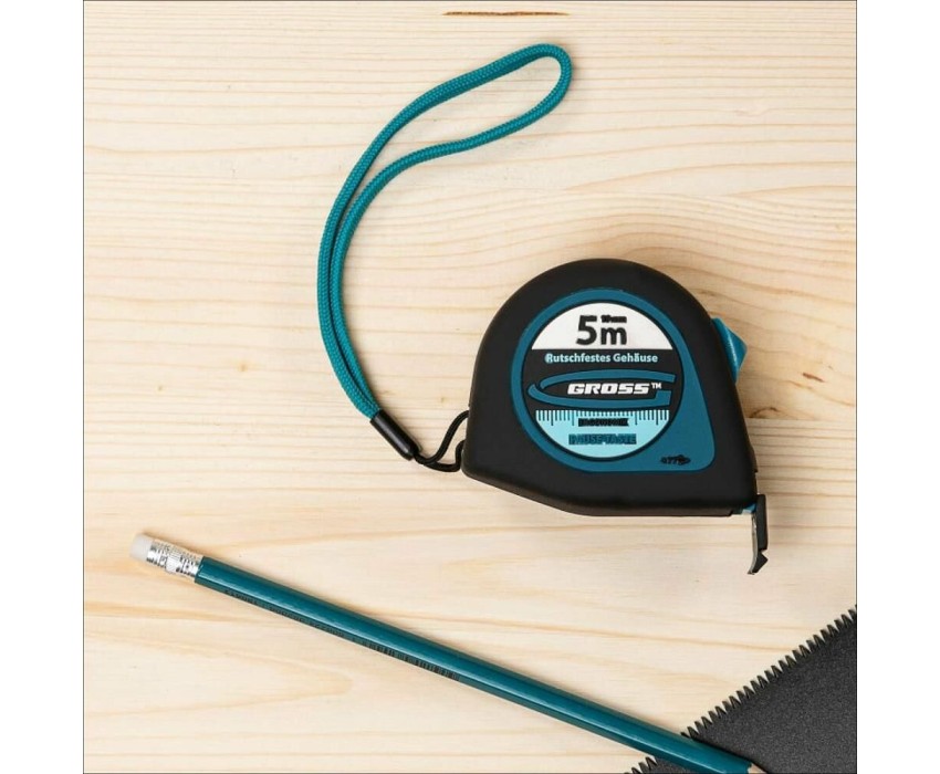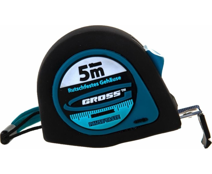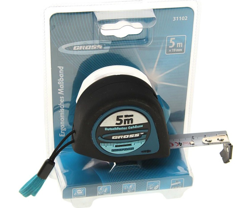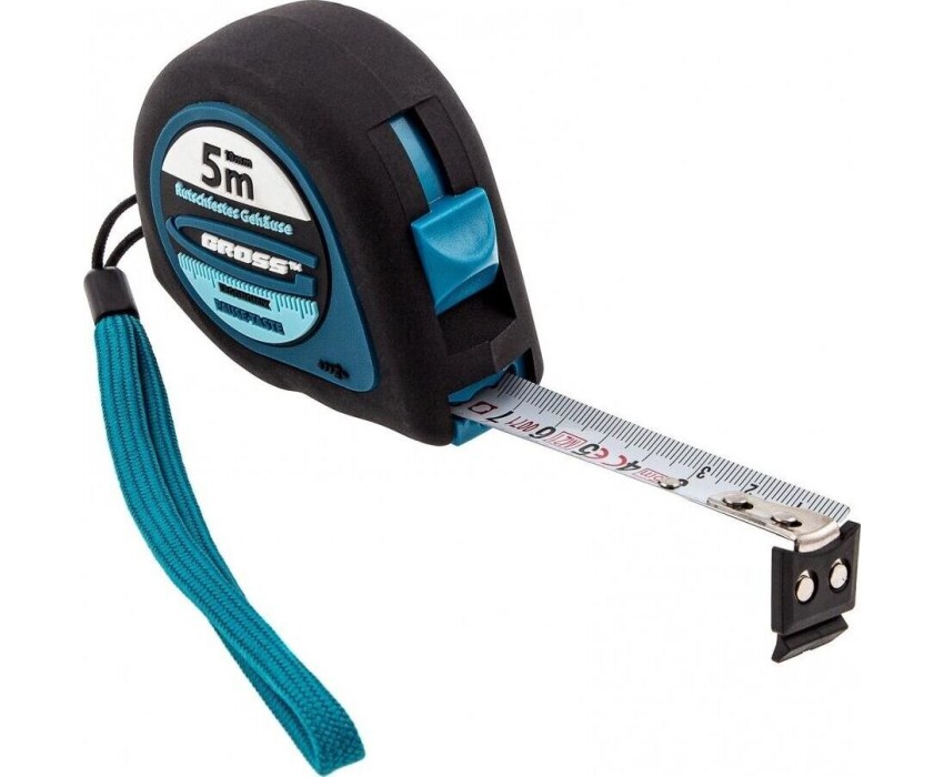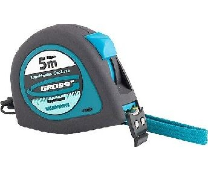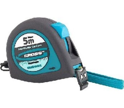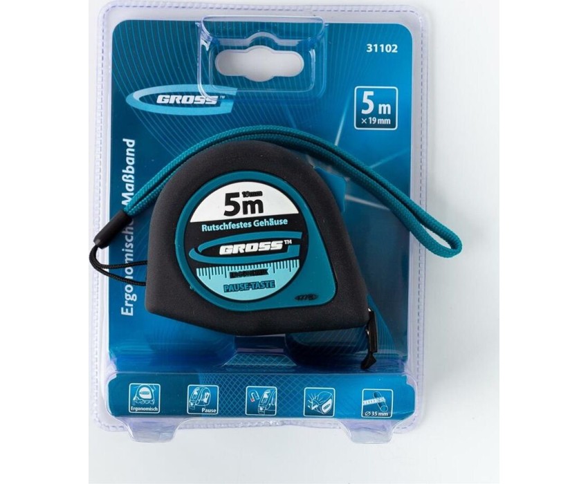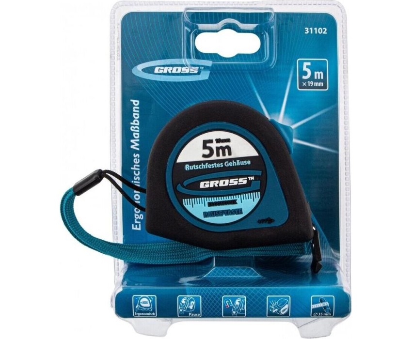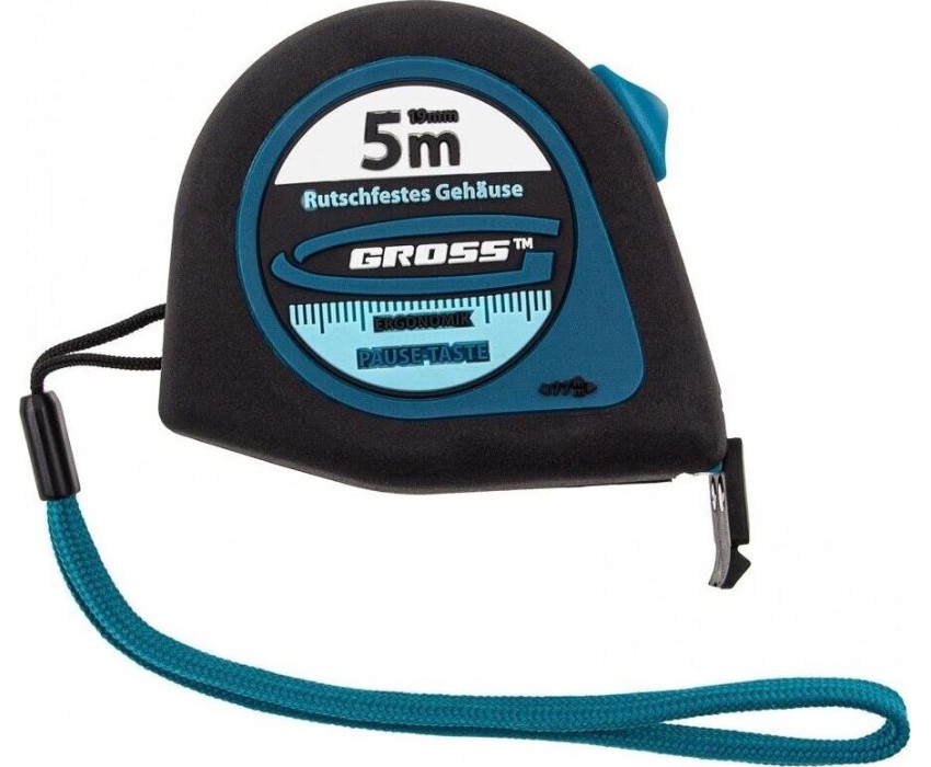 Рулетка Ergonomisch торговой марки GROSS с длиной ленты 5 м. Эргономичный корпус рулетки выполнен из ABS пластика (используется сырье BASF), который сохраняет работоспособность механизма при падении с высоты до 1,5 м. Измерительное полотно рулетки шириной 19 мм обладает высокими упругими свойствами, что позволяет производить измерения в труднодоступных местах. Основание измерительного полотна оснащено обрезиненным магнитным зацепом True Zero (истинный ноль), который обеспечивает фиксацию не только на ровных, но и на округлых поверхностях (например, на трубах). Зацеп True Zero позволяет более точно производить замеры от нуля при внешних/внутренних замерах.